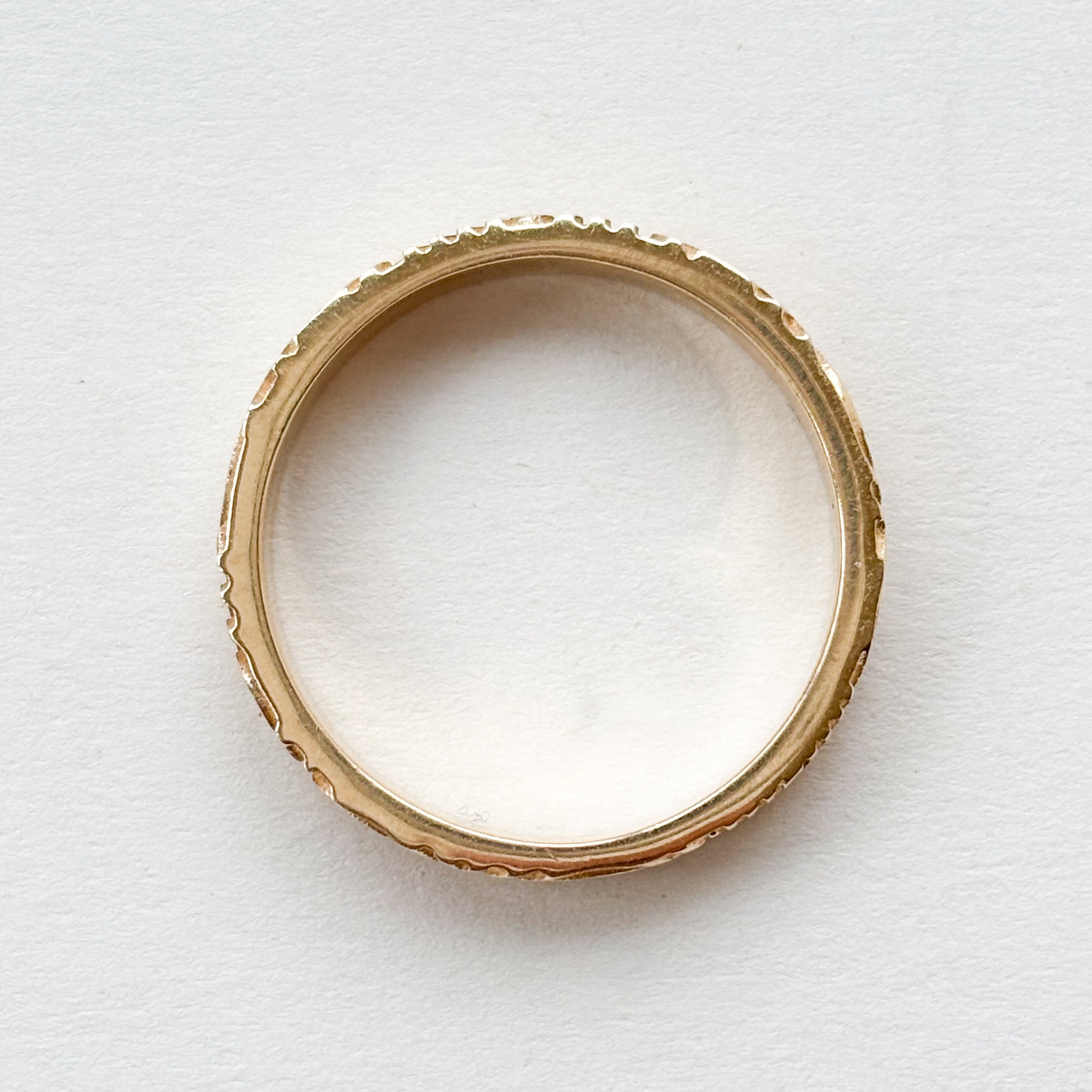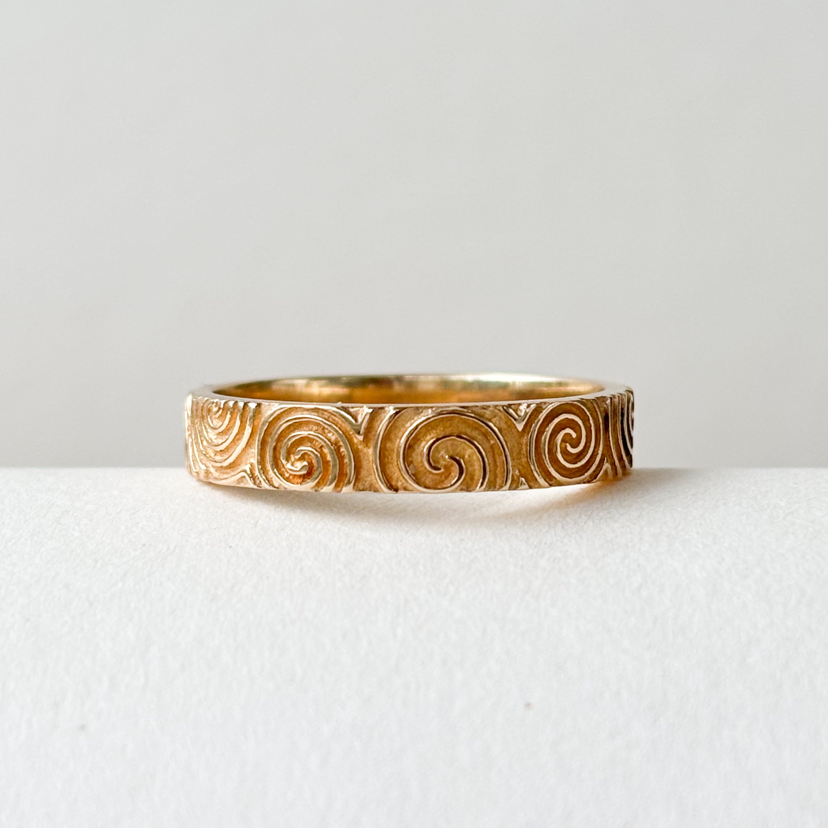 This one is something special — a bold 14ct gold ring, weighing 3.7 grams, featuring the iconic spiral motif of Newgrange. The spirals are deeply embossed into the band, giving it a rich, tactile feel that’s incredibly satisfying to the touch. On the reverse side, the surface is clean and polished.