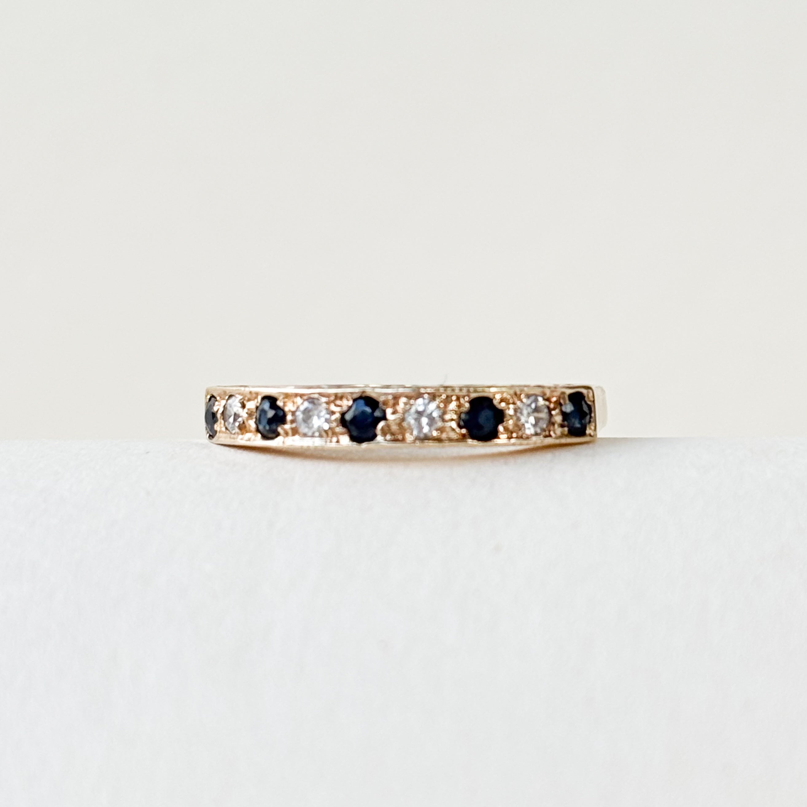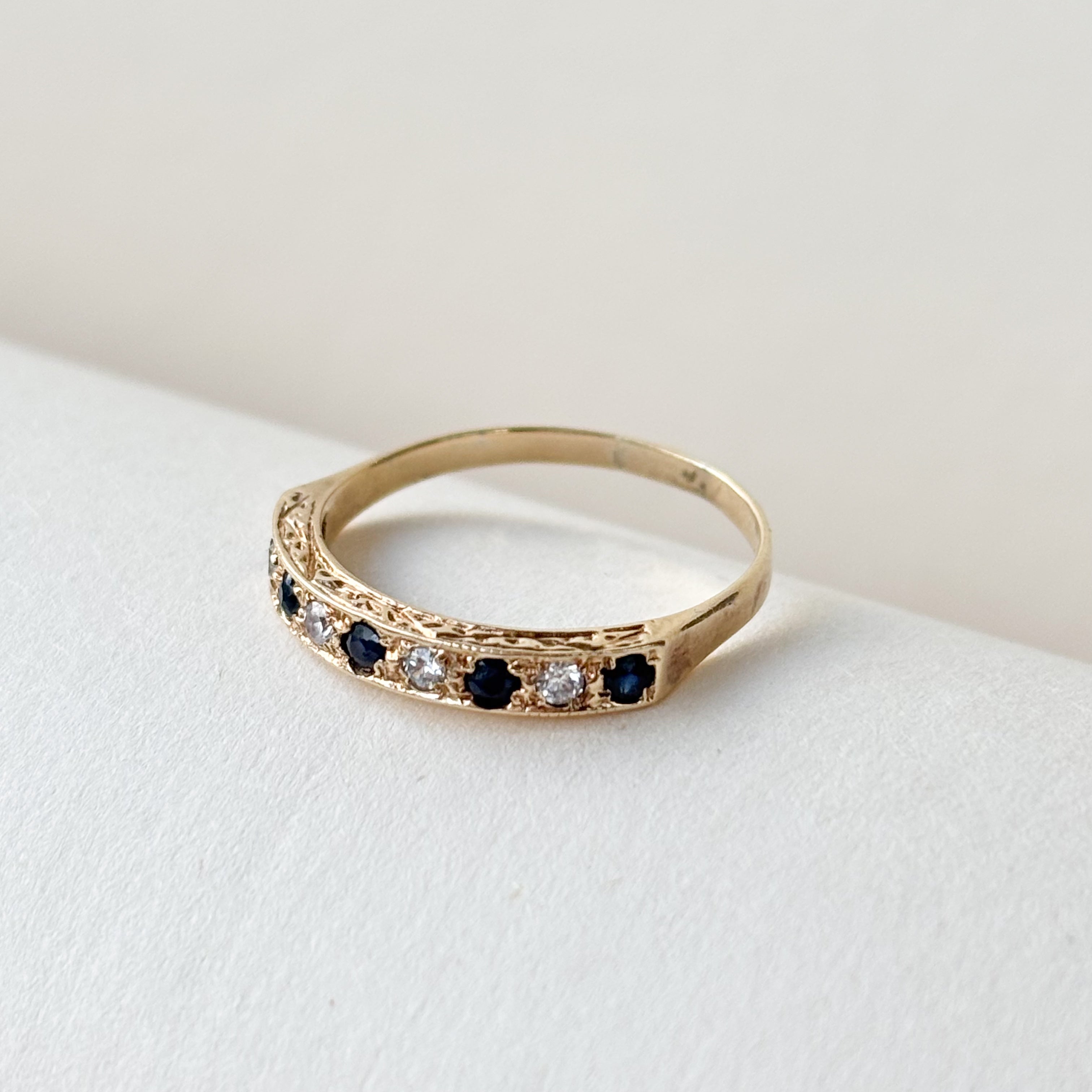 Stop. The. Search. Finding an eternity band with this much beauty is seriously tough, but my god, we found it! This is a gorgeous Natural Sapphire and CZ band, the true magic lies in the details. The sides of the band feature intricate, engraving—a classic vintage pattern that runs beautifully along the shoulders.