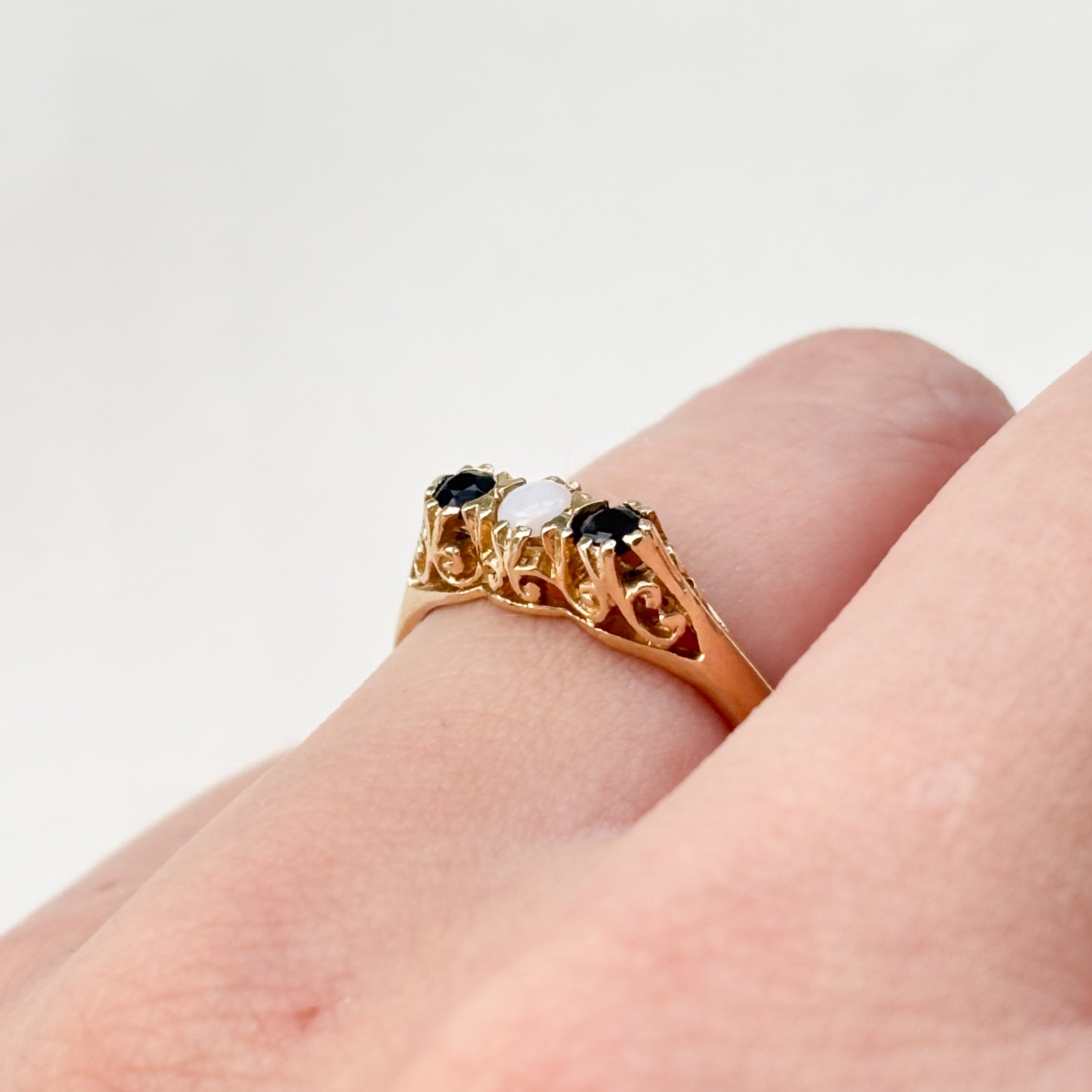 The movement is what we love: a central oval Precious Opal with a creamy base and internal liquid fire, perfectly anchored by two deep, velvety Natural Sapphires. The contrast is electric!!