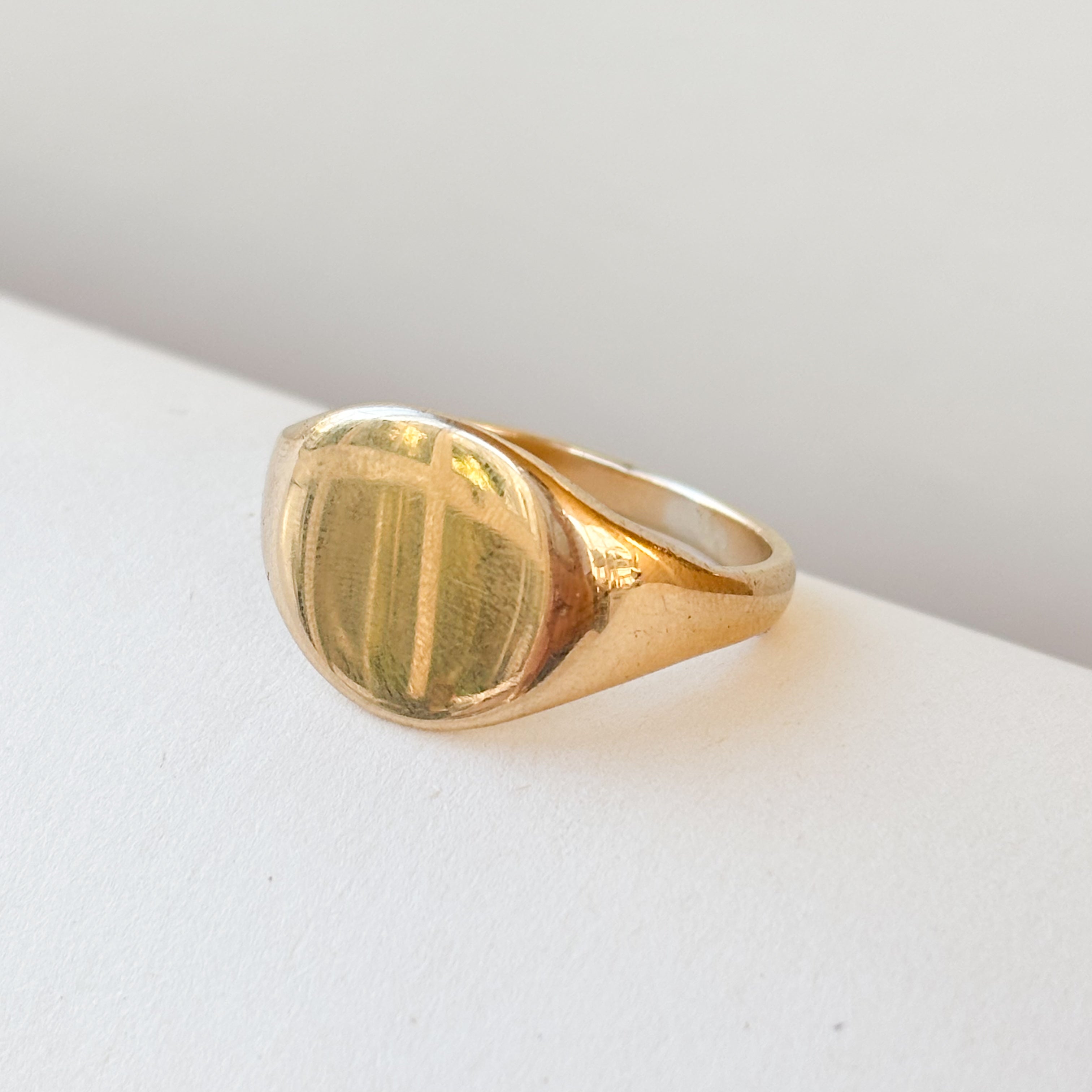 It's a beautiful, chunky 9ct gold oval signet that is waiting to be engraved.