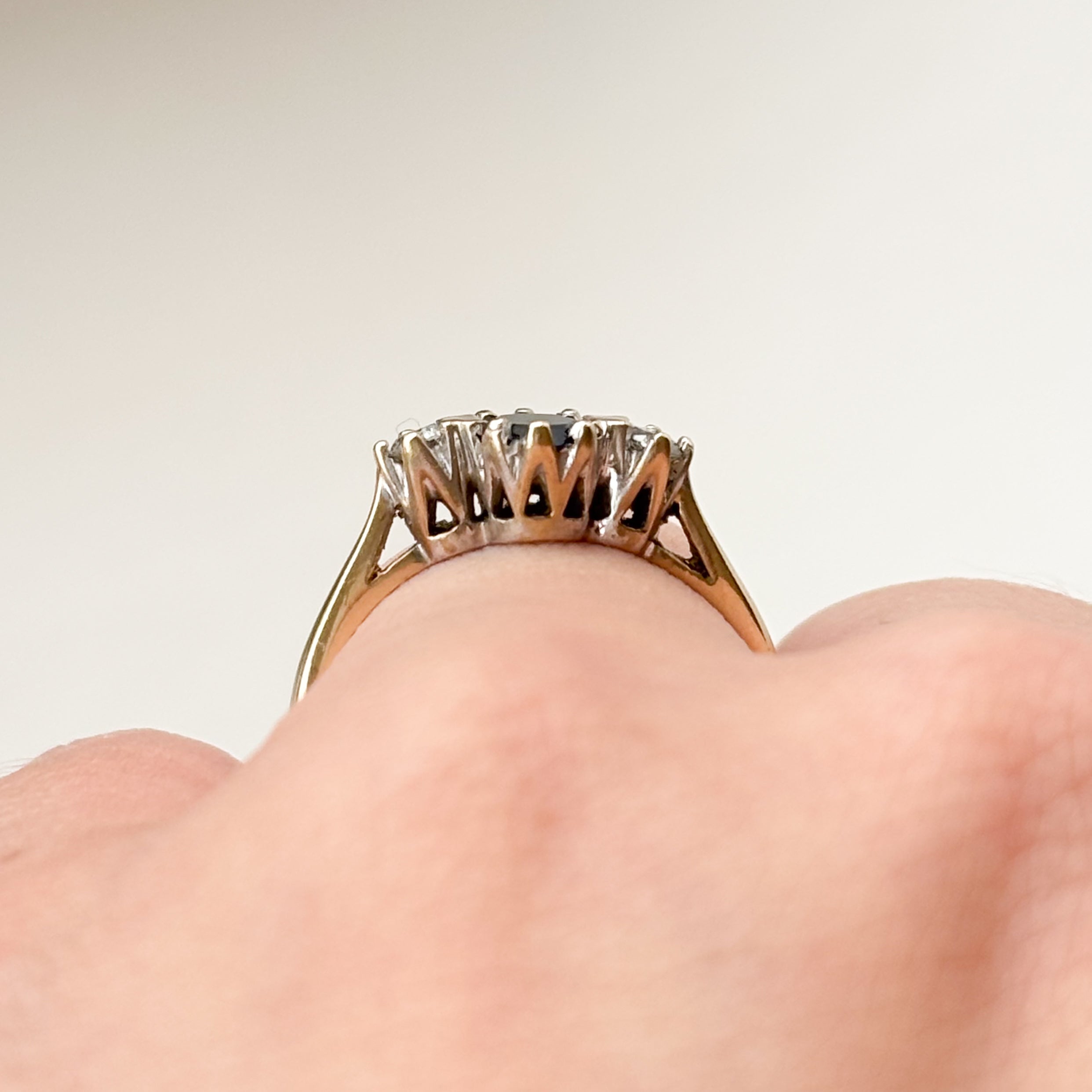 The sapphire is held by gorgeous, chunky claw prongs, and the CZ stones are tucked in with these wonderful bar and crown settings that give the piece incredible character and structure.
