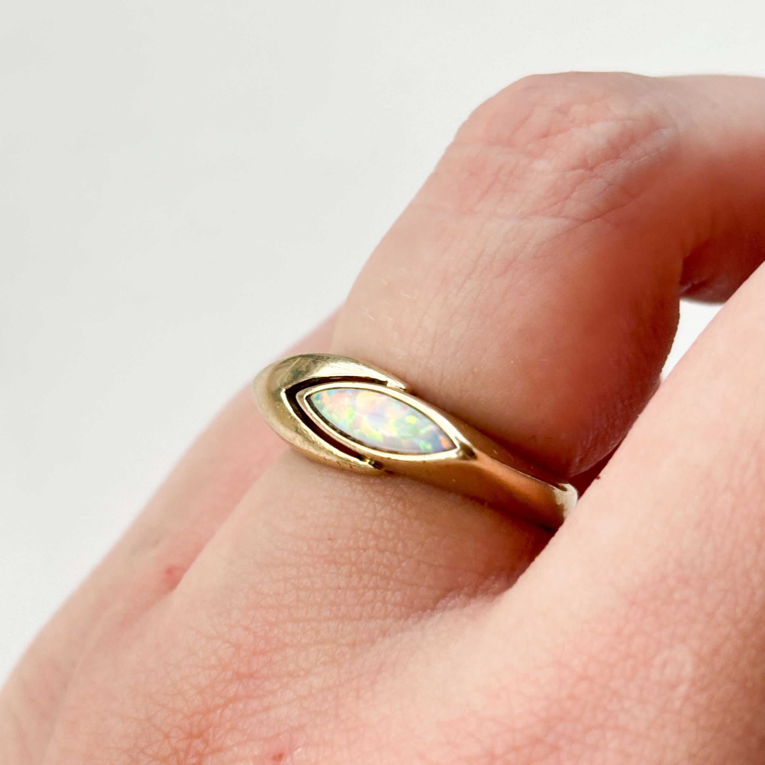 Centre-stage is a vibrant Synthetic Opal in a cool marquise or boat shape, absolutely bursting with fiery flashes of green, red, and blue. It is perfectly inlaid into the setting, giving the whole ring a smooth, comfortable finish.