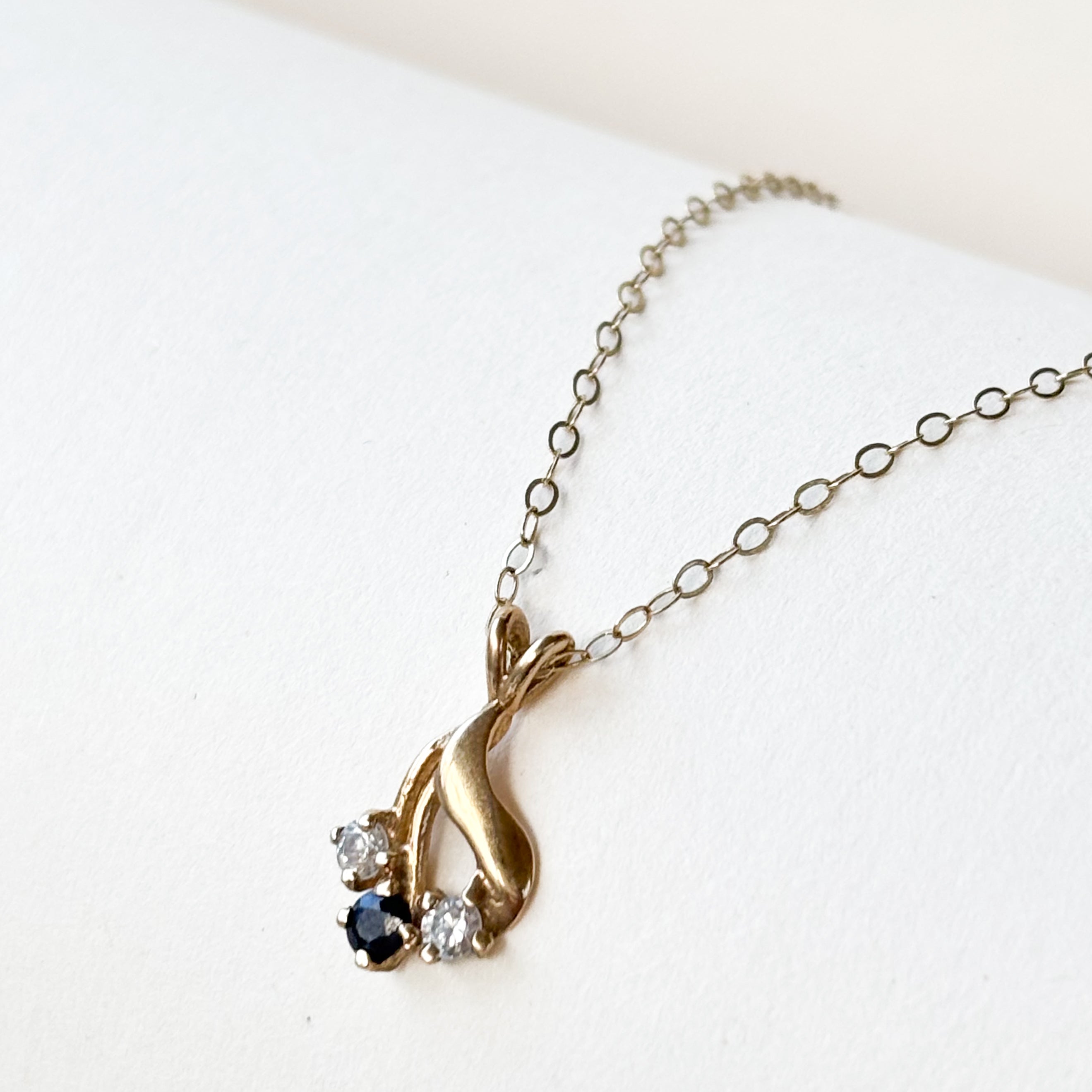 We adore this piece - The design is a gorgeous, flowing scroll or ribbon, gently twisting down to hold a trio of stones. Centre-stage is a inky Synthetic Sapphire, flanked by two bright, sparkling CZs. It's the sweetest little trilogy moment!
