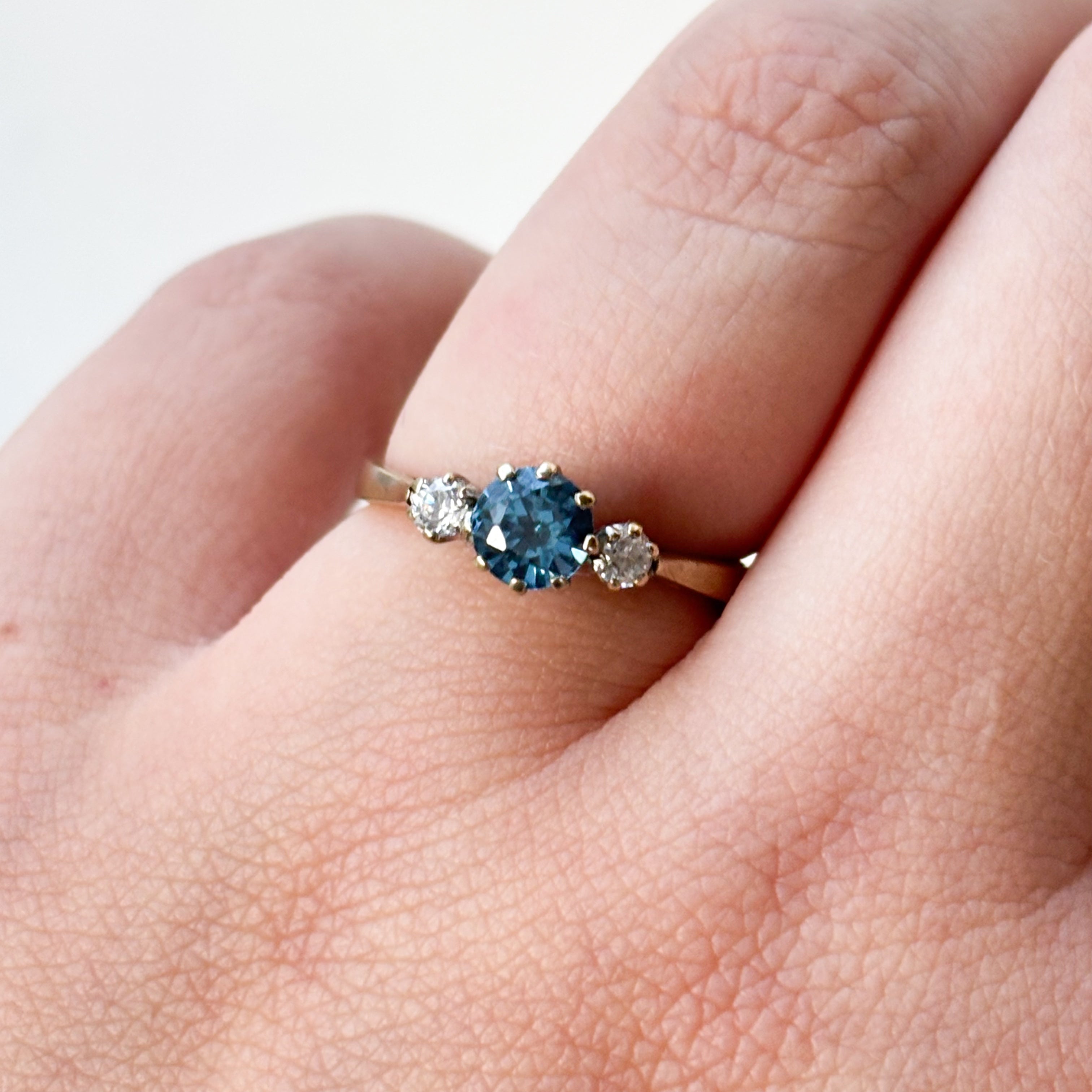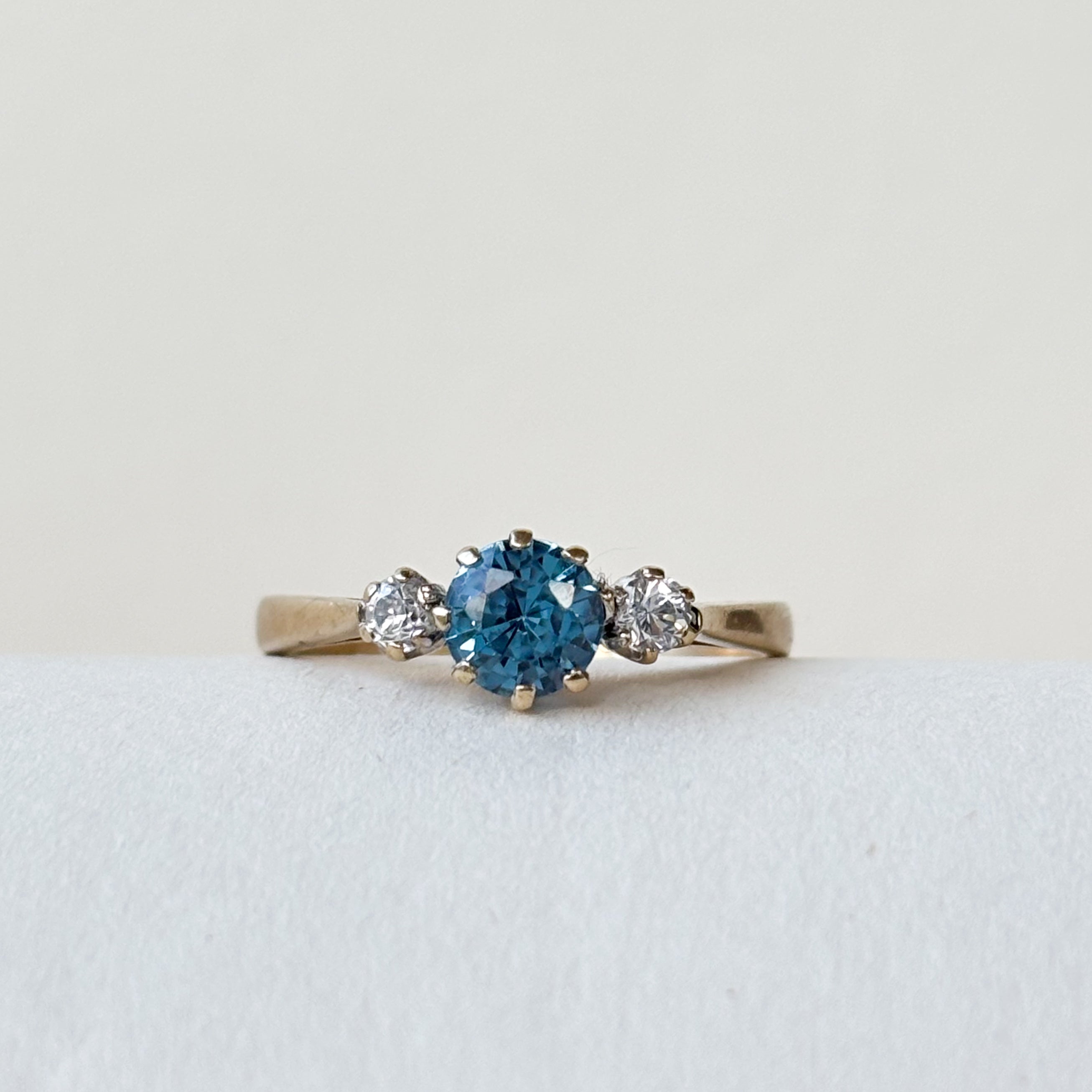 Centre-stage is a vibrant Synthetic Spinel in a stunning round cut—it has this incredible, almost teal-blue hue that is just amazing. Flanked on either side by two bright, brilliant-cut CZs, the contrast is pure magic.