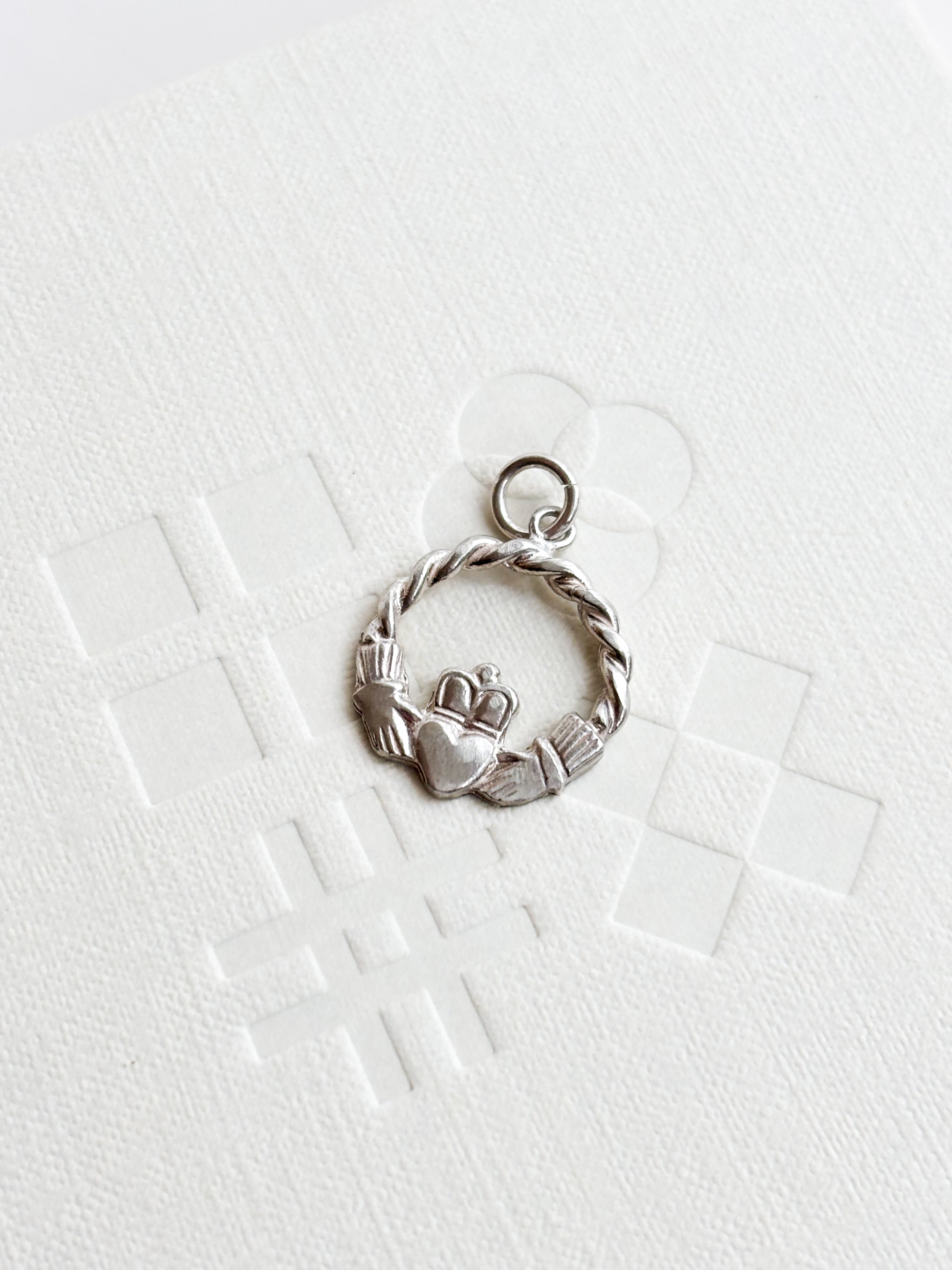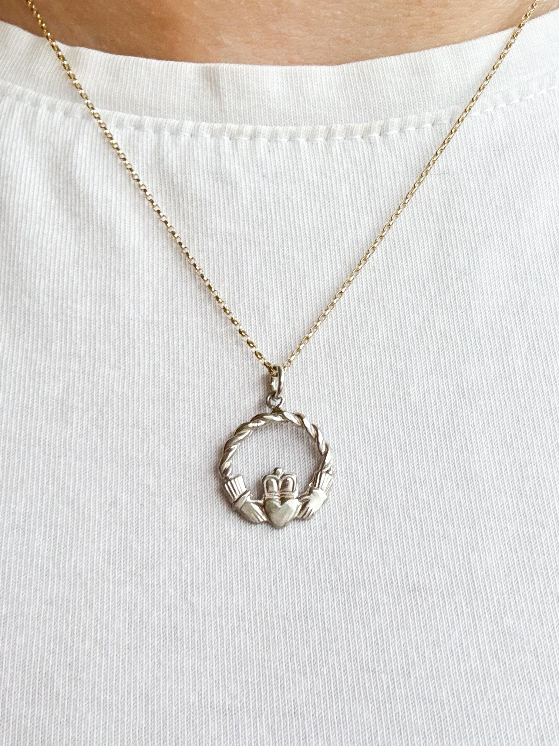 This one is a total beauty. A proper Irish classic with a twist—literally! This sterling silver braided Claddagh pendant is truly extraordinary, framed by a gorgeous rope-detail hoop.