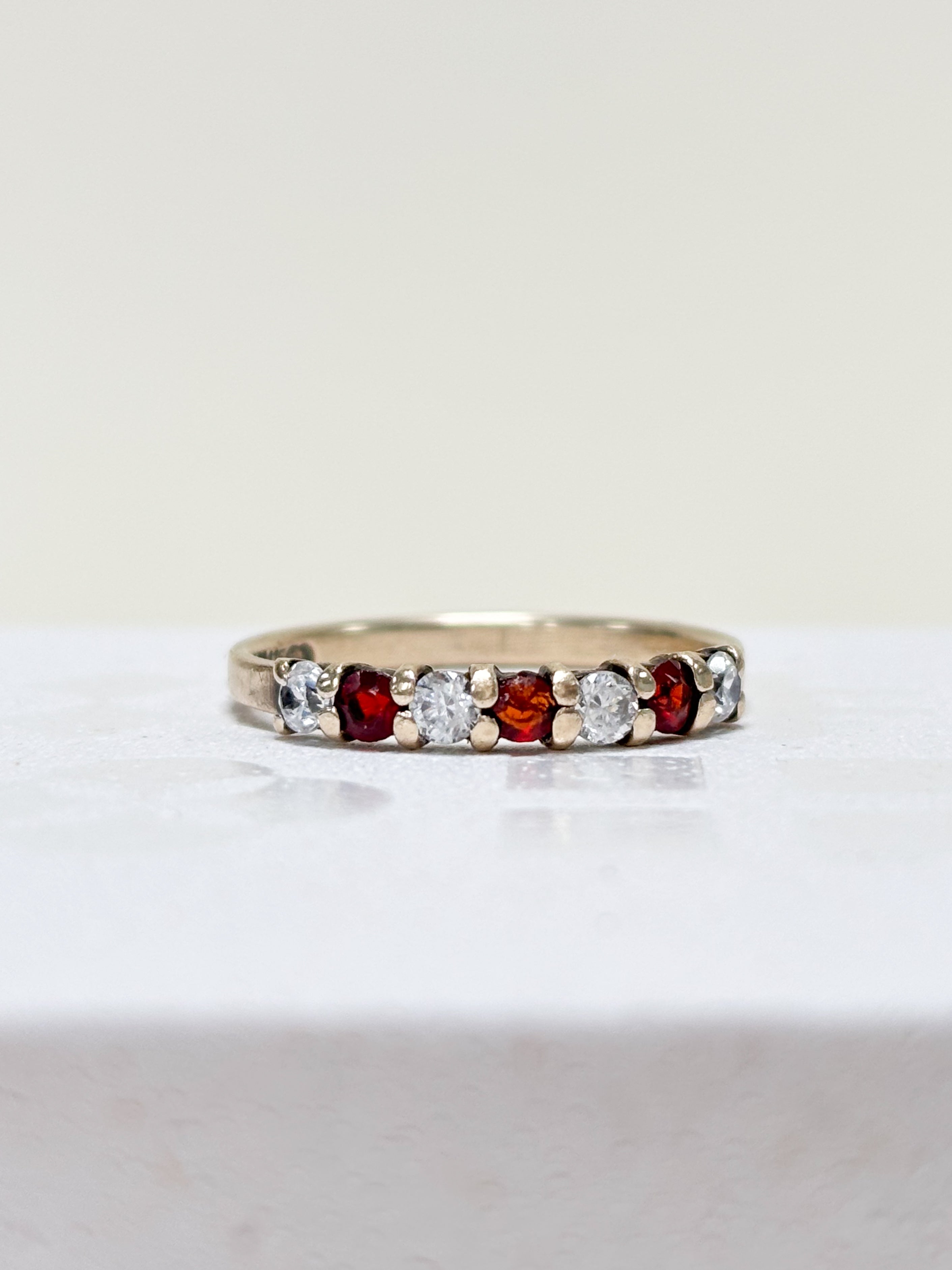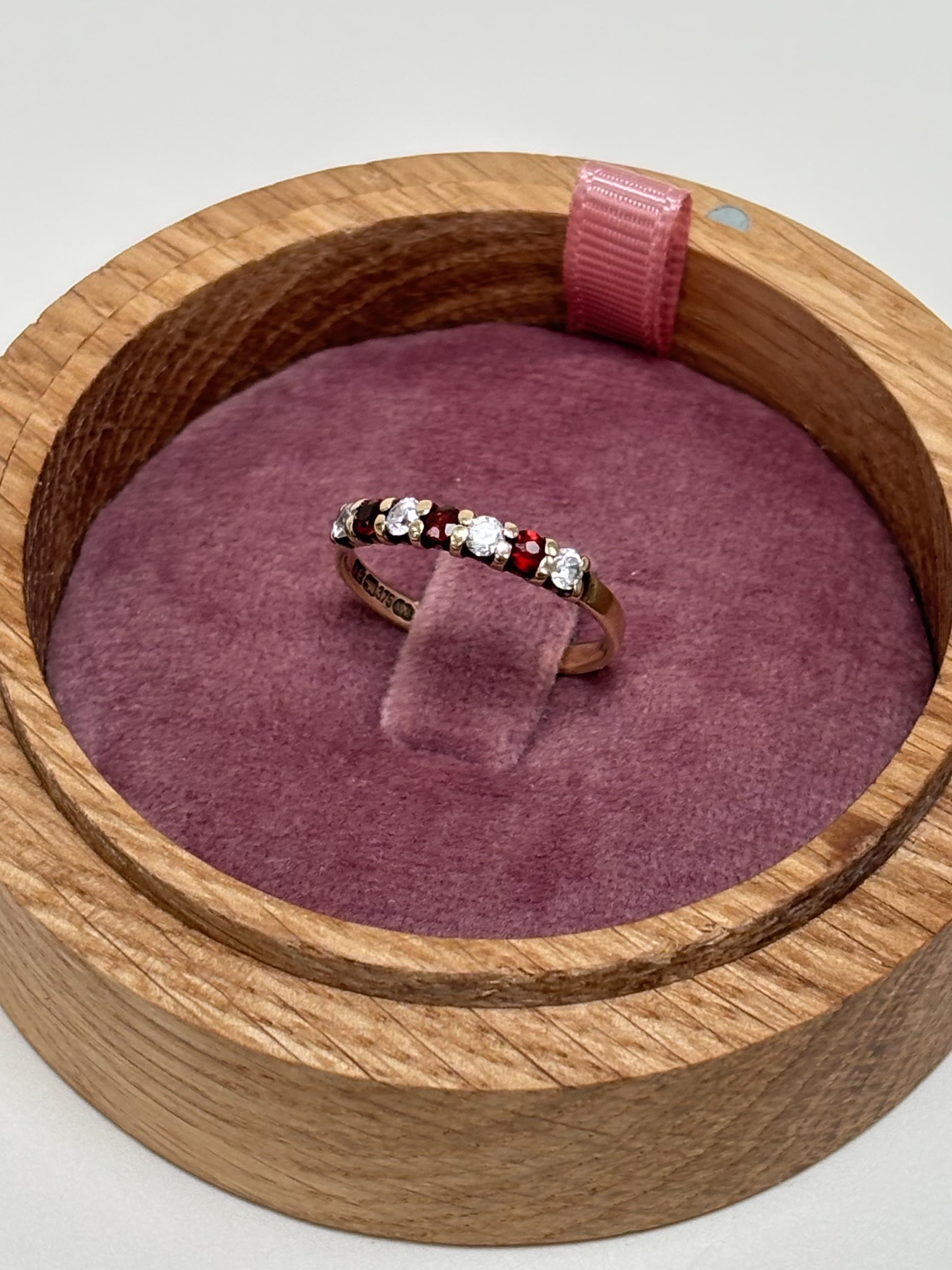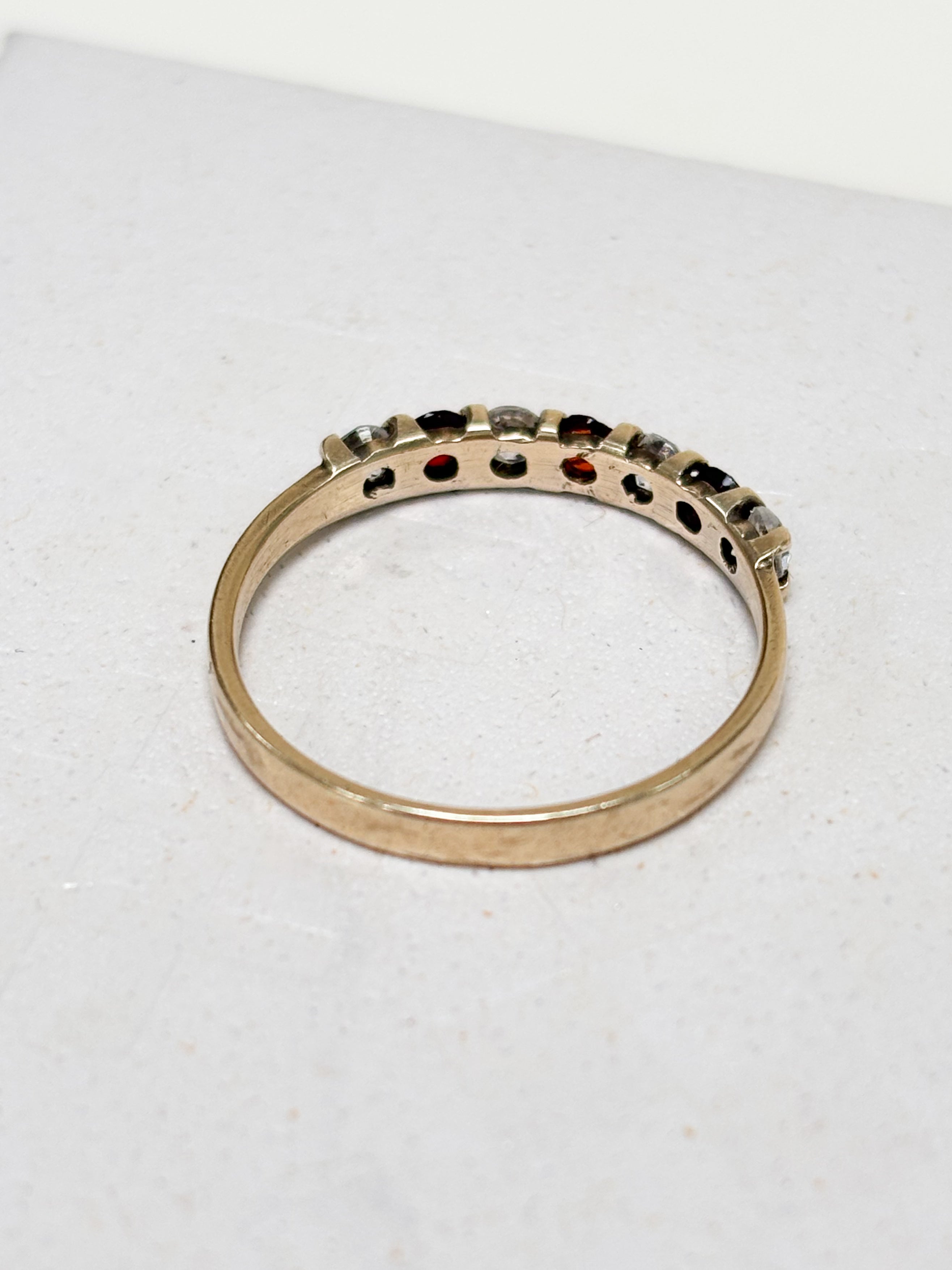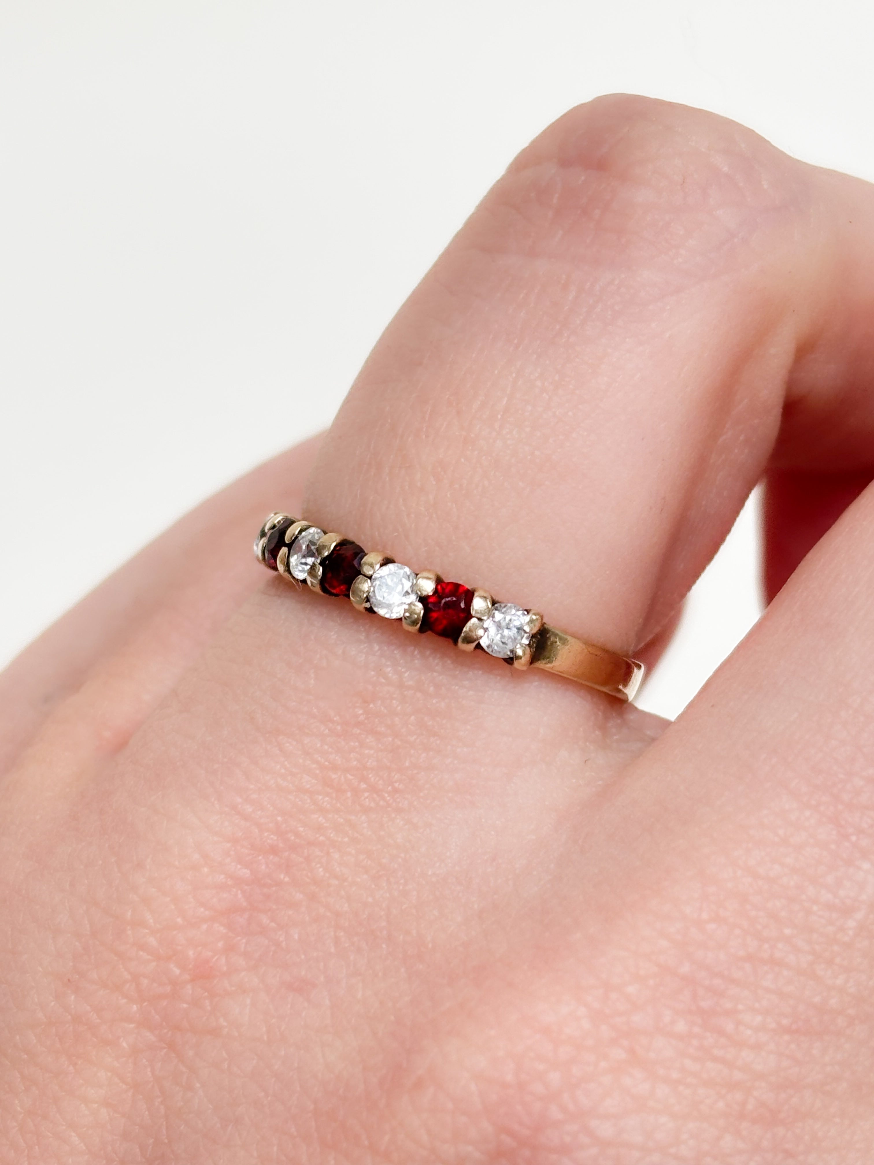 This 9ct Gold CZ & Garnet Eternity Ring is a total five-stone dream team. It features a punchy contrast of round brilliant-cut gems, alternating between a deep red orange and crystal-clear sparkle.