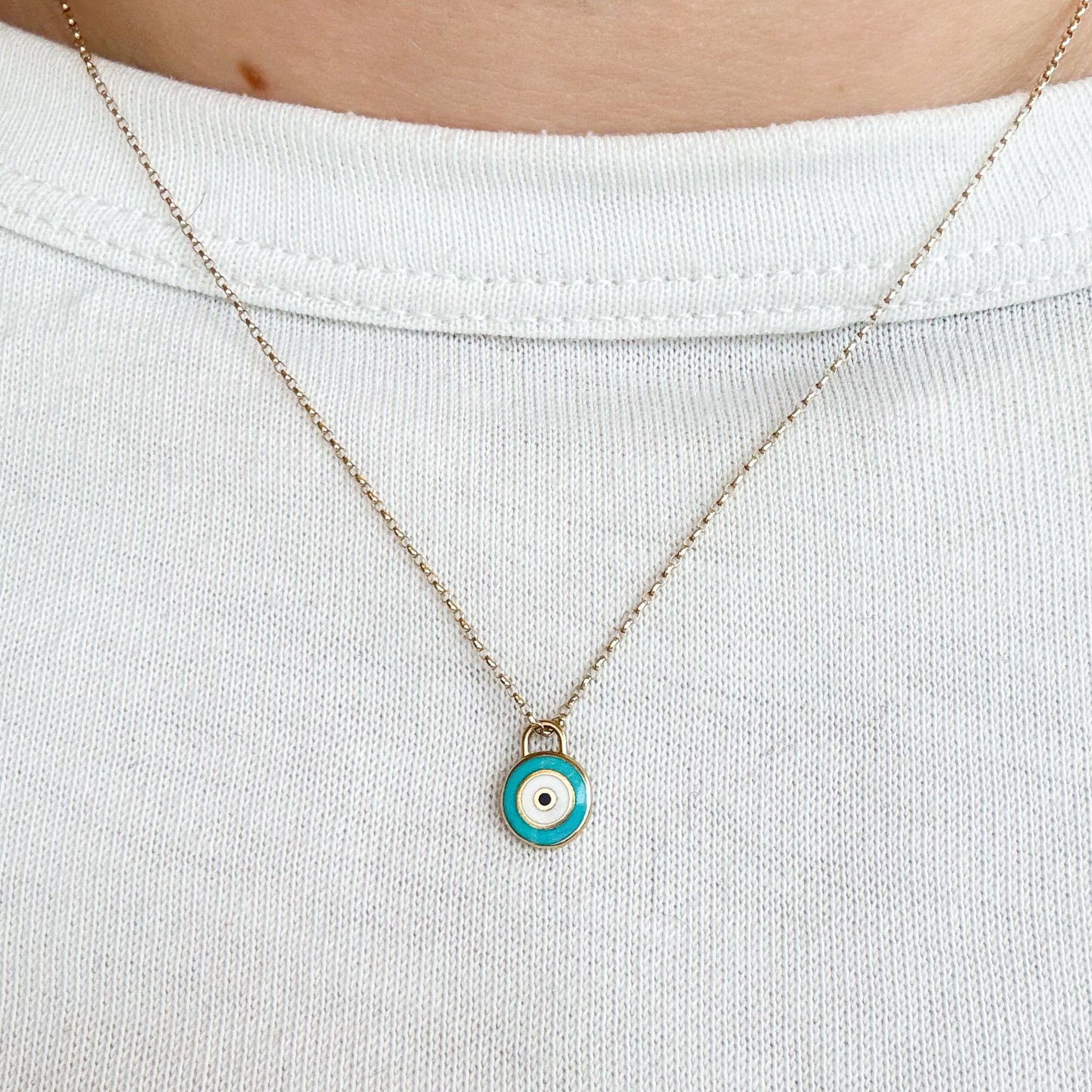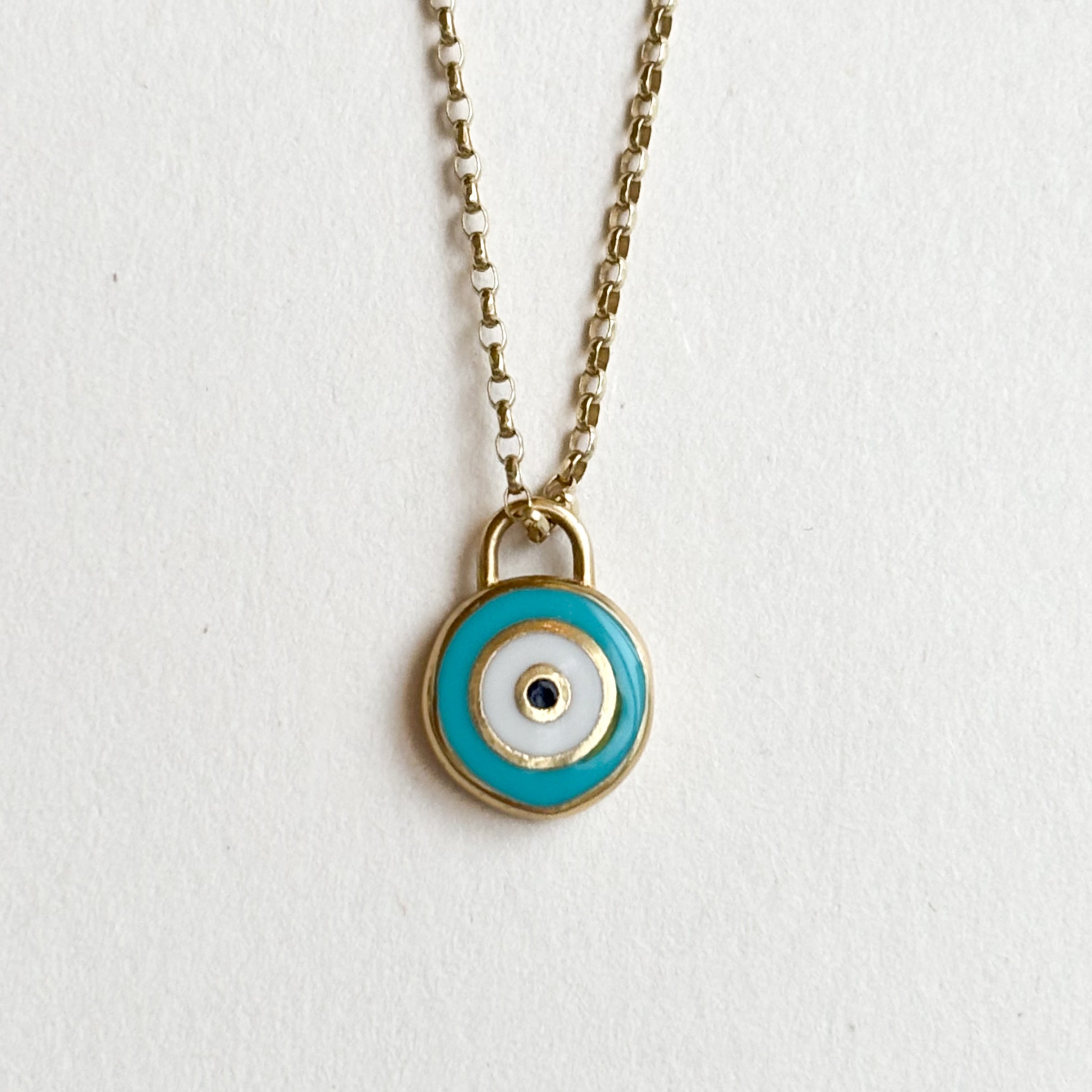 This piece is all about the details—the vibrant turquoise is framed perfectly in gold, creating a pop of color that feels both ancient and completely modern. Weighing 0.66g on its own, it’s a dainty little talisman designed to watch over you. Pair it with our 18-inch fine cable link chain, making it the perfect weight for someone who loves their jewellery meaningful and easy to wear every single day.