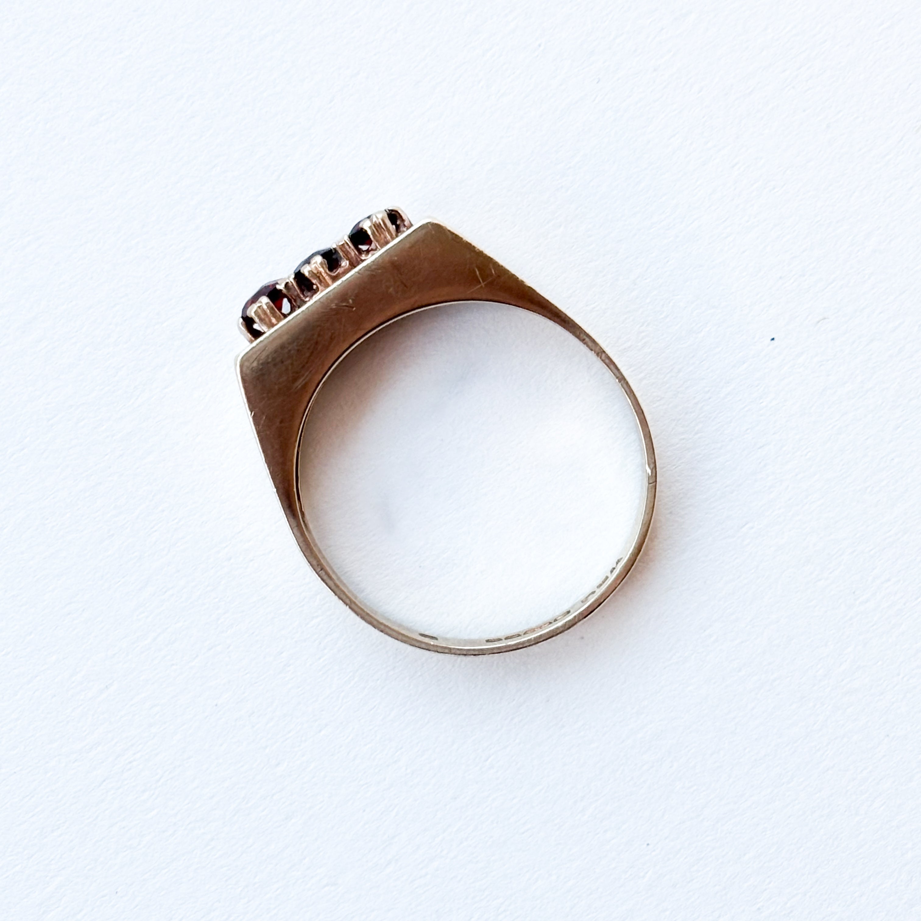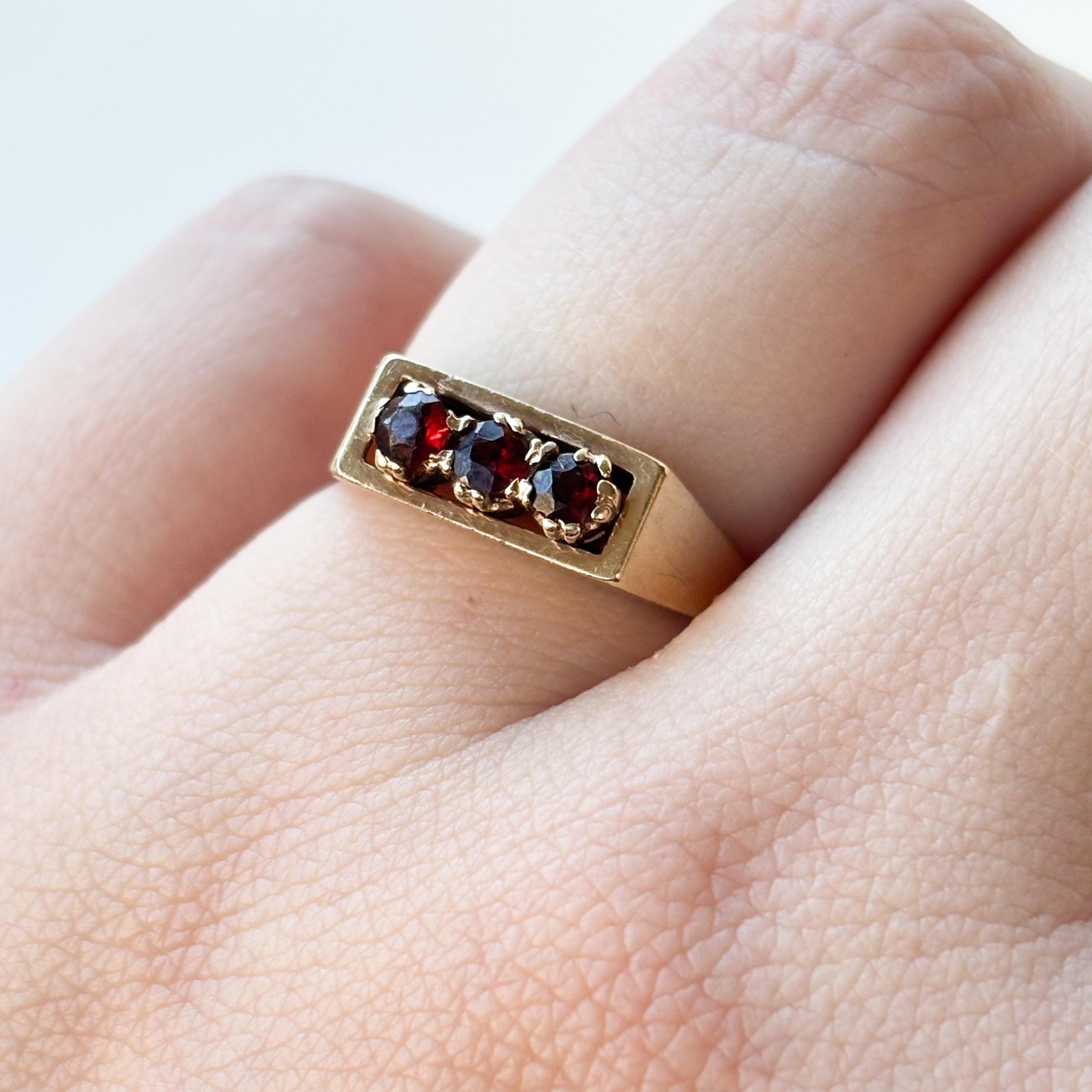 The design features three deep, moody garnets set into a sleek rectangular face, giving it a bold, geometric edge that feels both modern and timeless. We adore how the stones are held in place by those delicate prongs, creating a stunning contrast against the polished gold band.