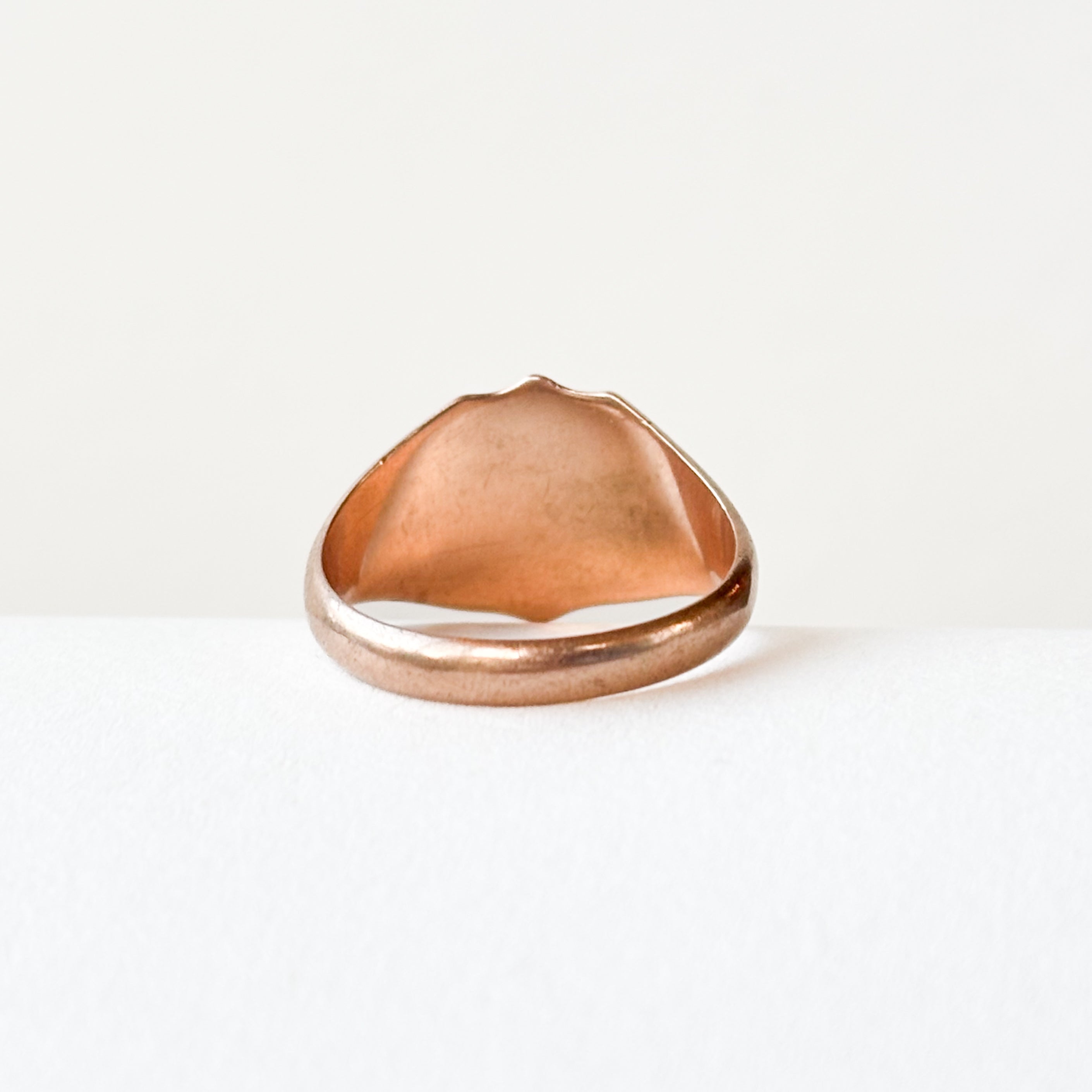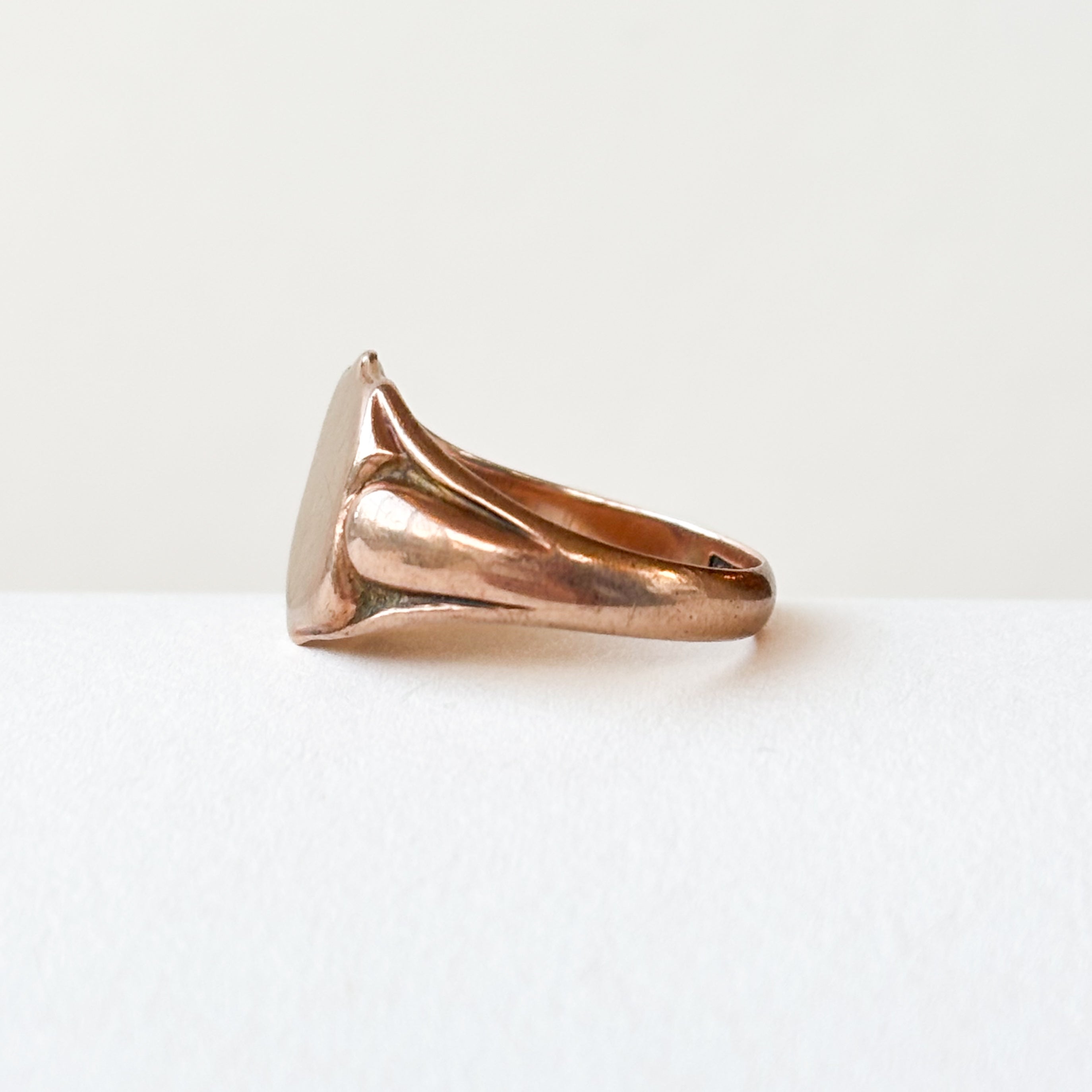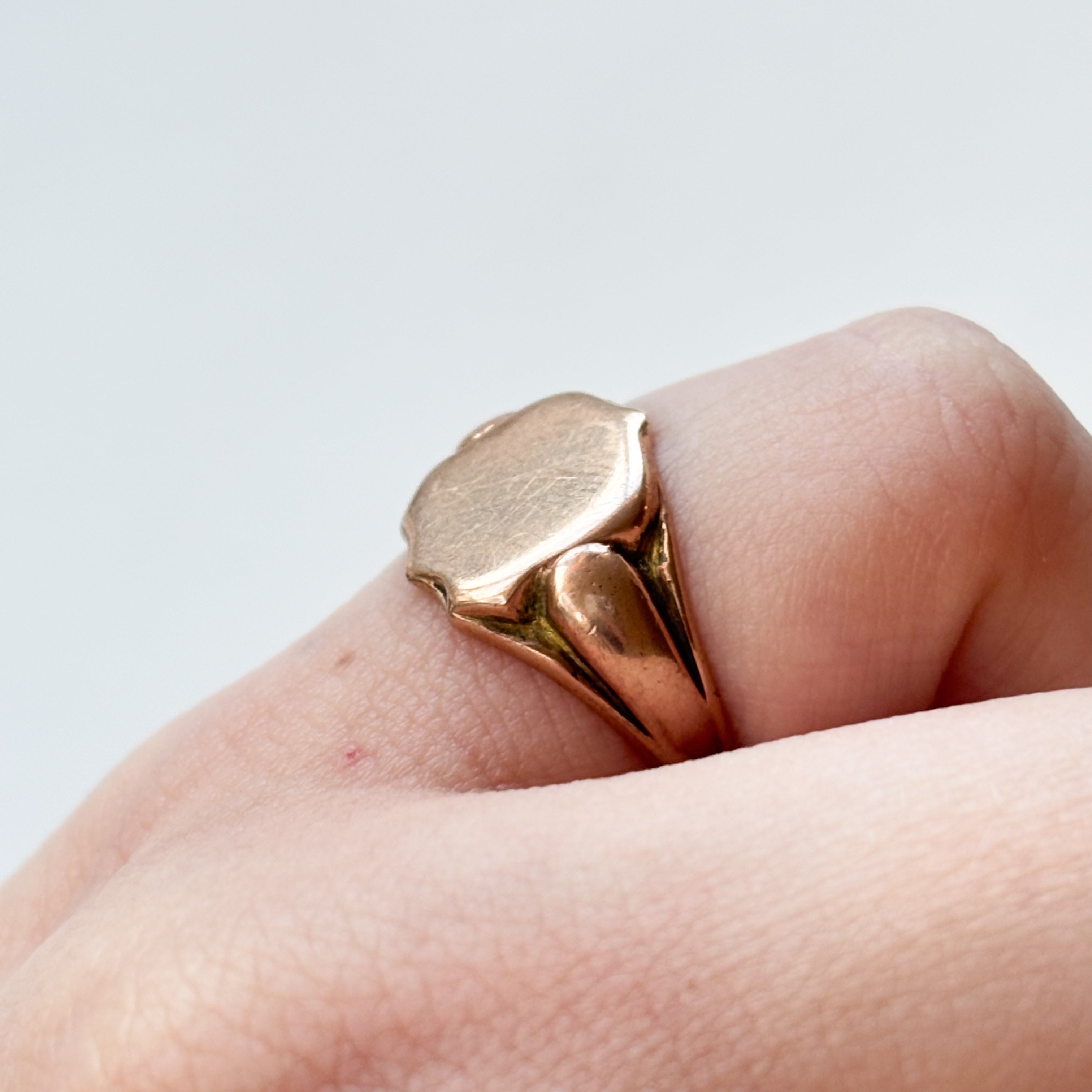 The face features a classic shield shape, left blank and ready for your own story—or kept as is to appreciate that beautiful, soft patina. We are obsessed with the shoulders on this one; the carved, tapering detail adds a sophisticated architectural element that feels much more special than a standard modern band.