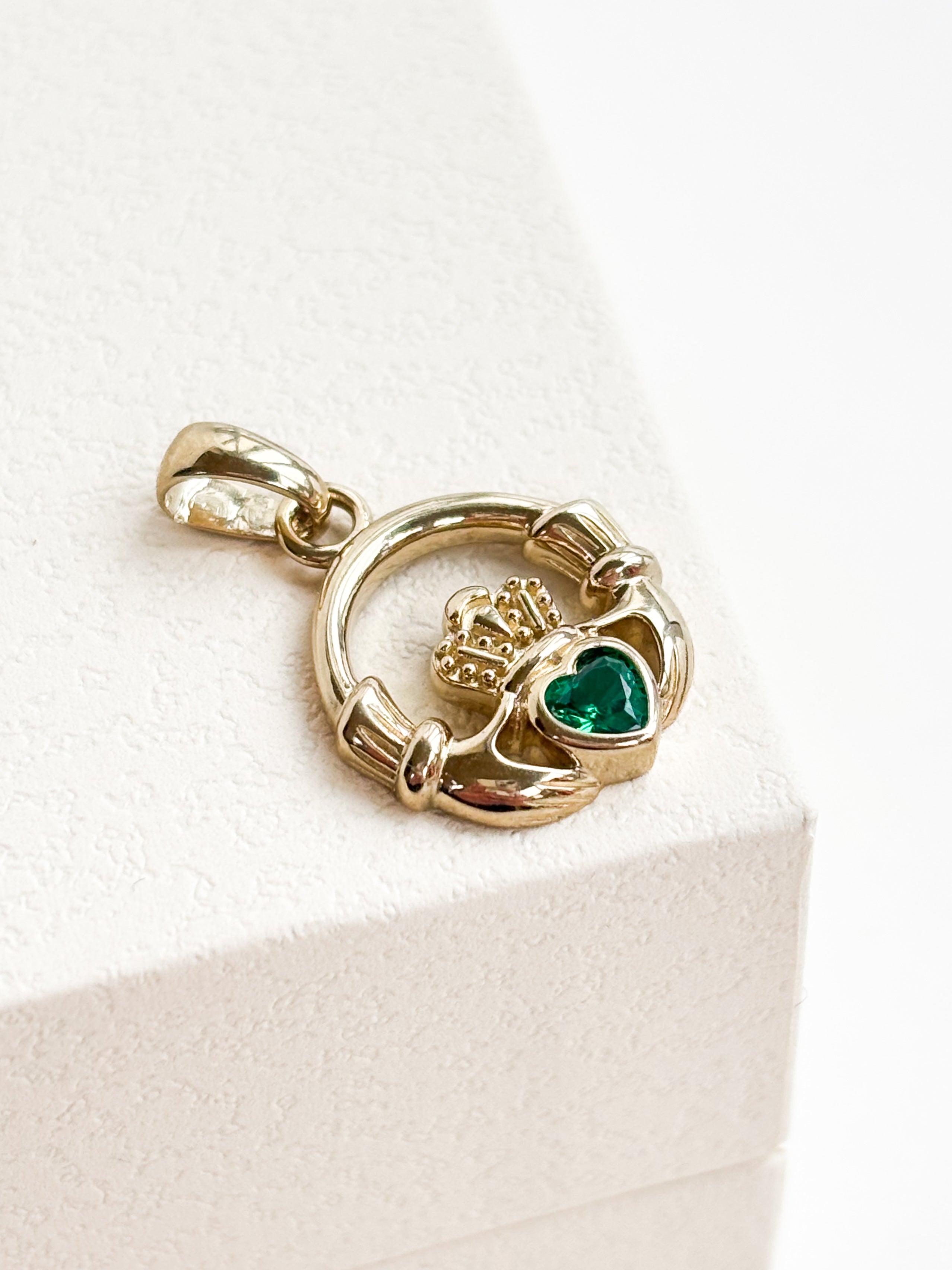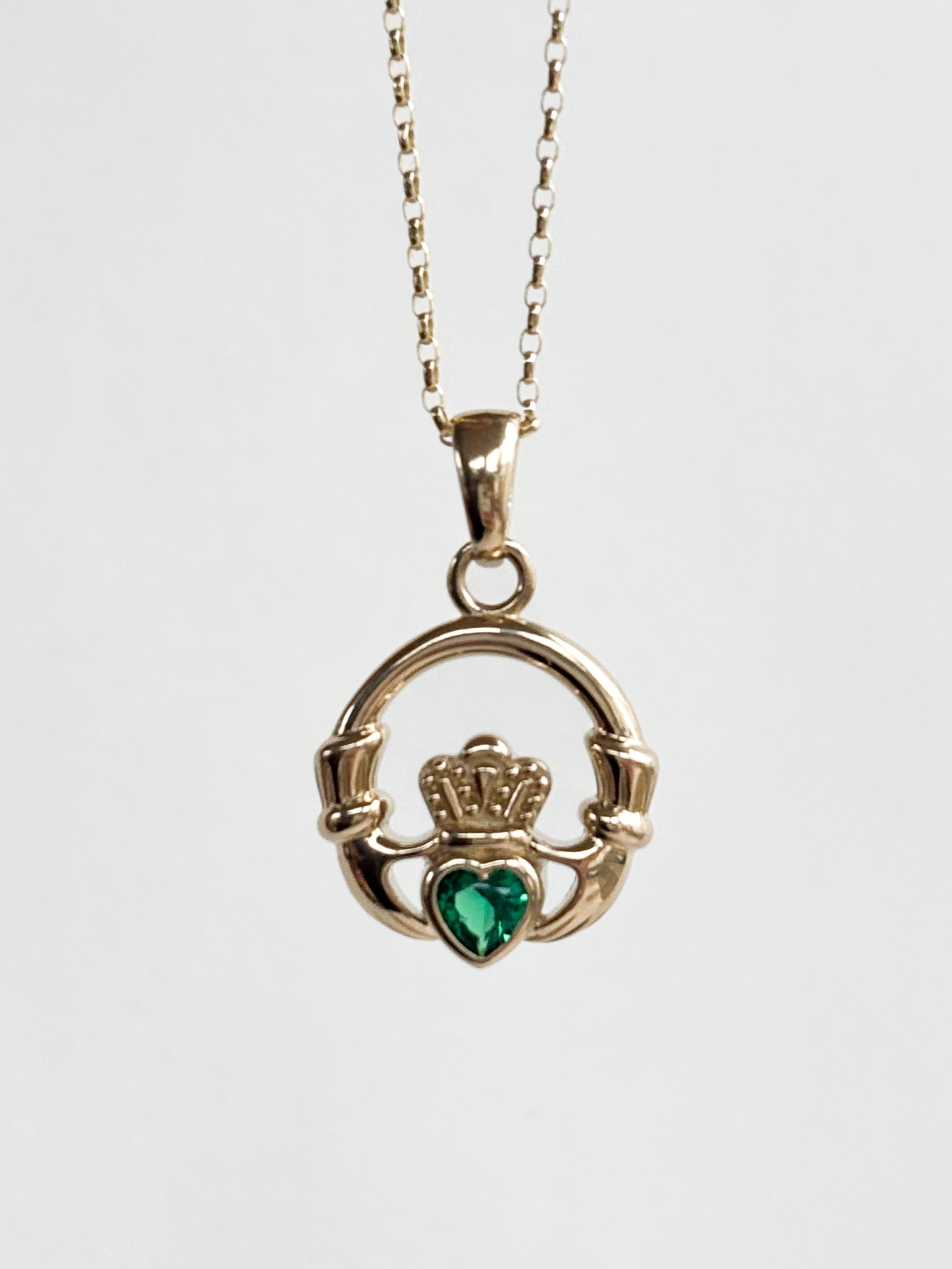 The star of the show is the stunning Irish-made Claddagh pendant. It features a striking green stone centre and a 2D construction that "comes out" beautifully, giving it a fantastic, sculptural feel. Every detail—from the crown to the braided surround—is in incredible condition.