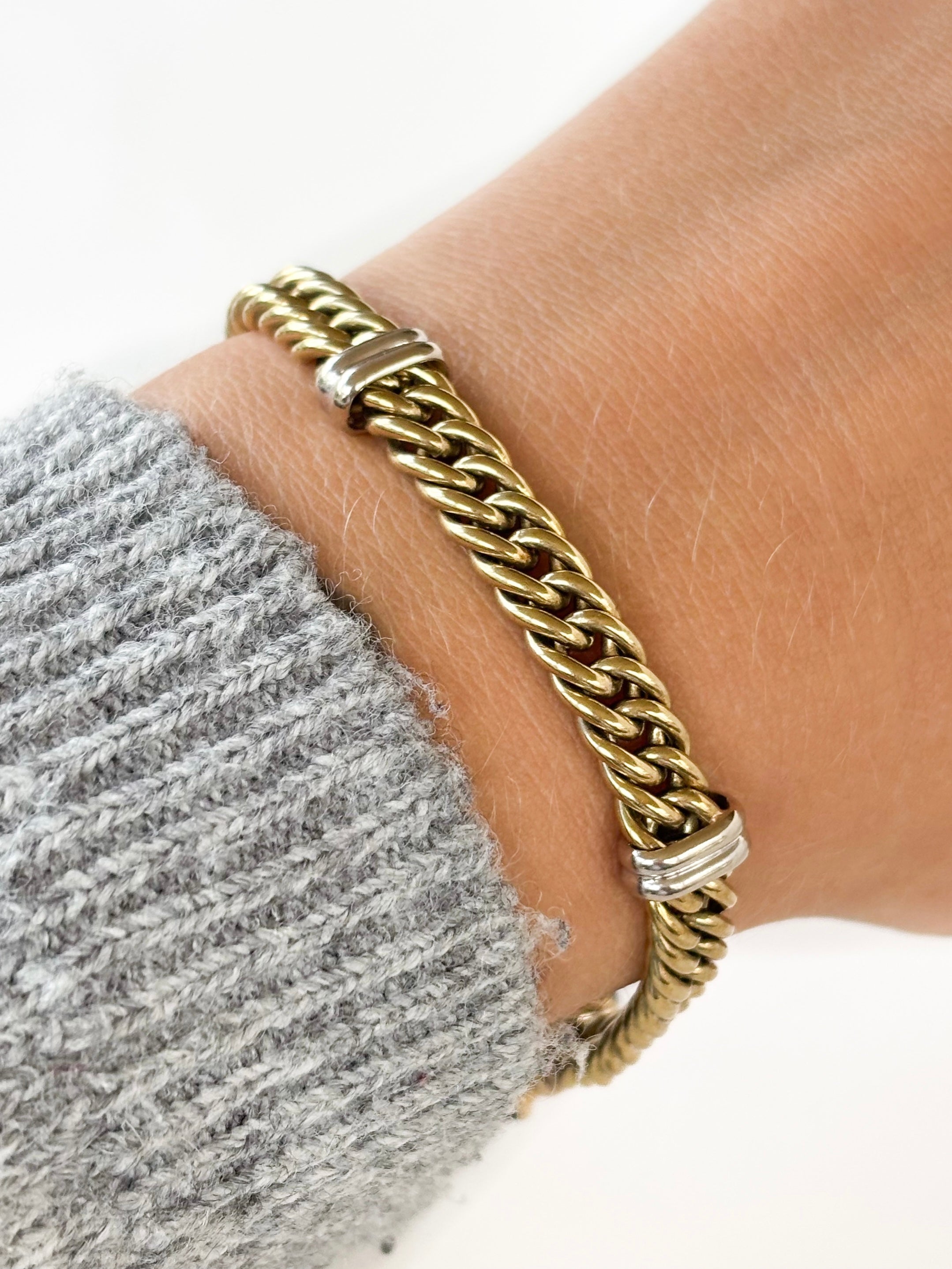 The bolt clasp is both secure and cool, blending seamlessly into the design for a clean, modern and somehow, we don't know how as we know they are opposites, vintage look. Perfect worn solo for maximum impact or stacked with other bracelets for a curated, high-fashion wrist.