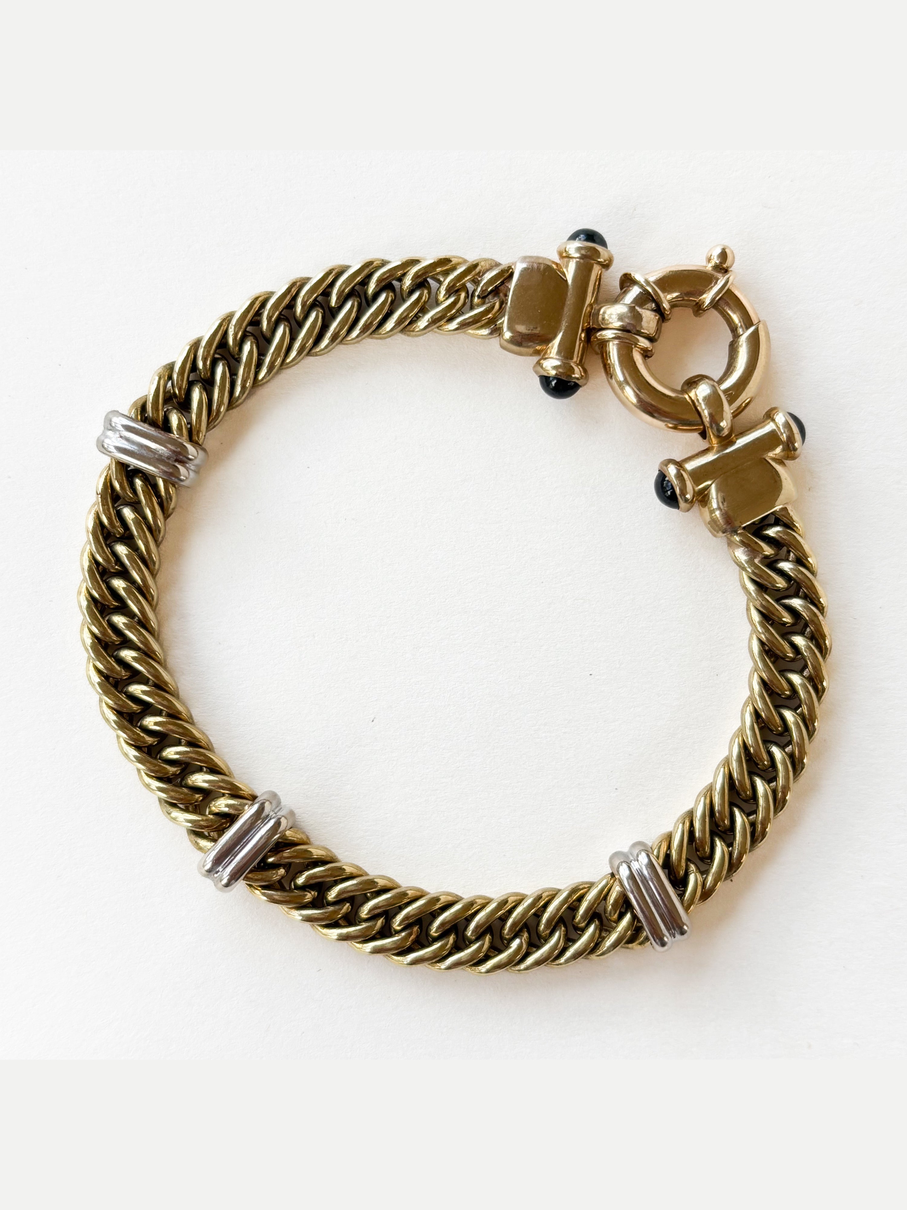This is THE bracelet to last a life time— the extremely solid curb link with a large solid bolt clasp is crafted in 9ct gold, weighing in at 31.6 grams(!), it is the heaviest piece we've ever had in our collection. The solid construction and beautiful design gives it real presence on the wrist, while the 4(!) sapphire cabochon on the sides of the clasp add a subtle pop of colour. With this bracelet every single detail is thought out.