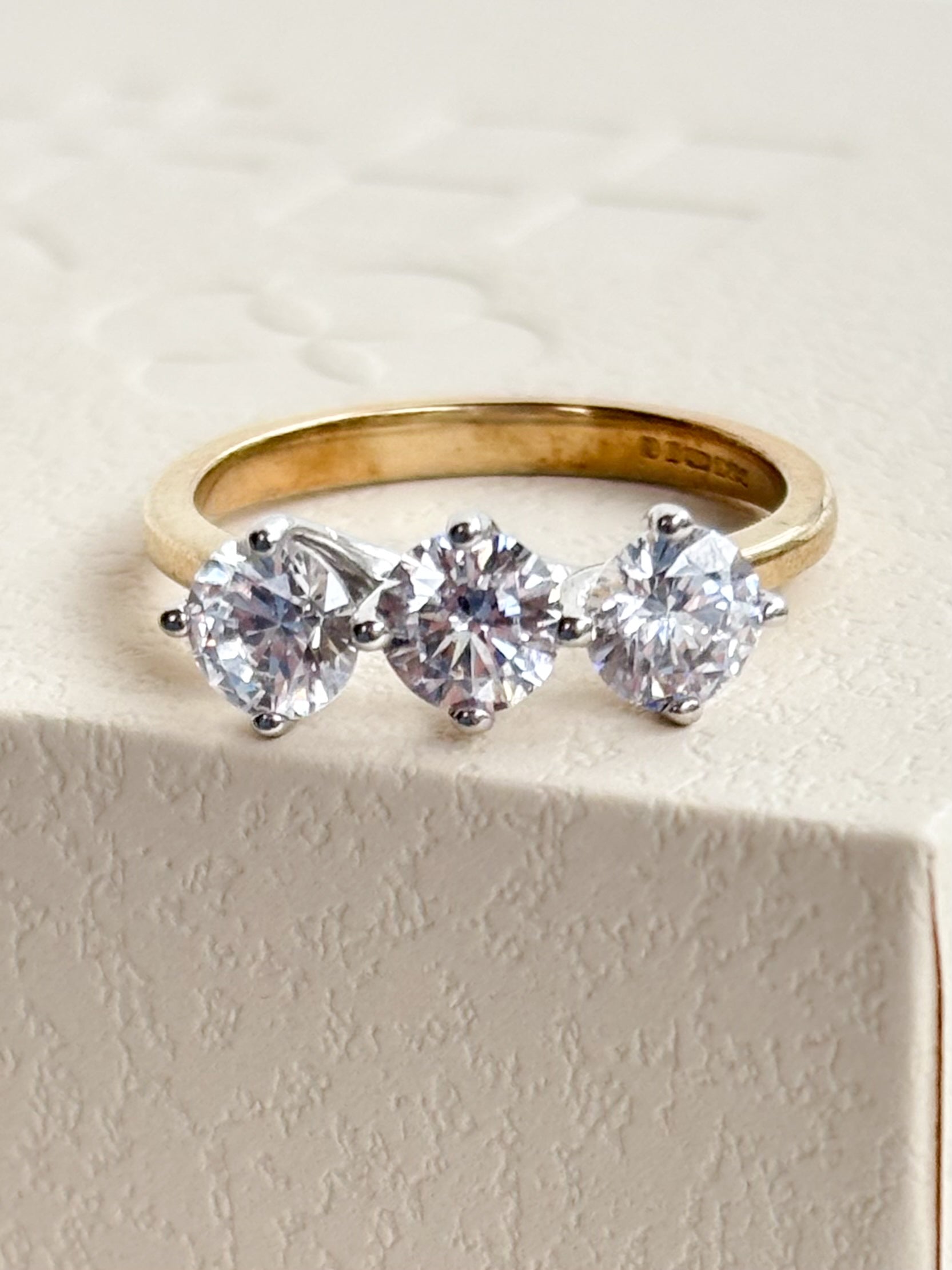 This CZ trilogy ring is a complete showstopper—the perfect way to bring a little bit of refined sparkle to your everyday stack. 9ct gold, the design features three brilliant-cut CZ stones that catch the light from every single angle.