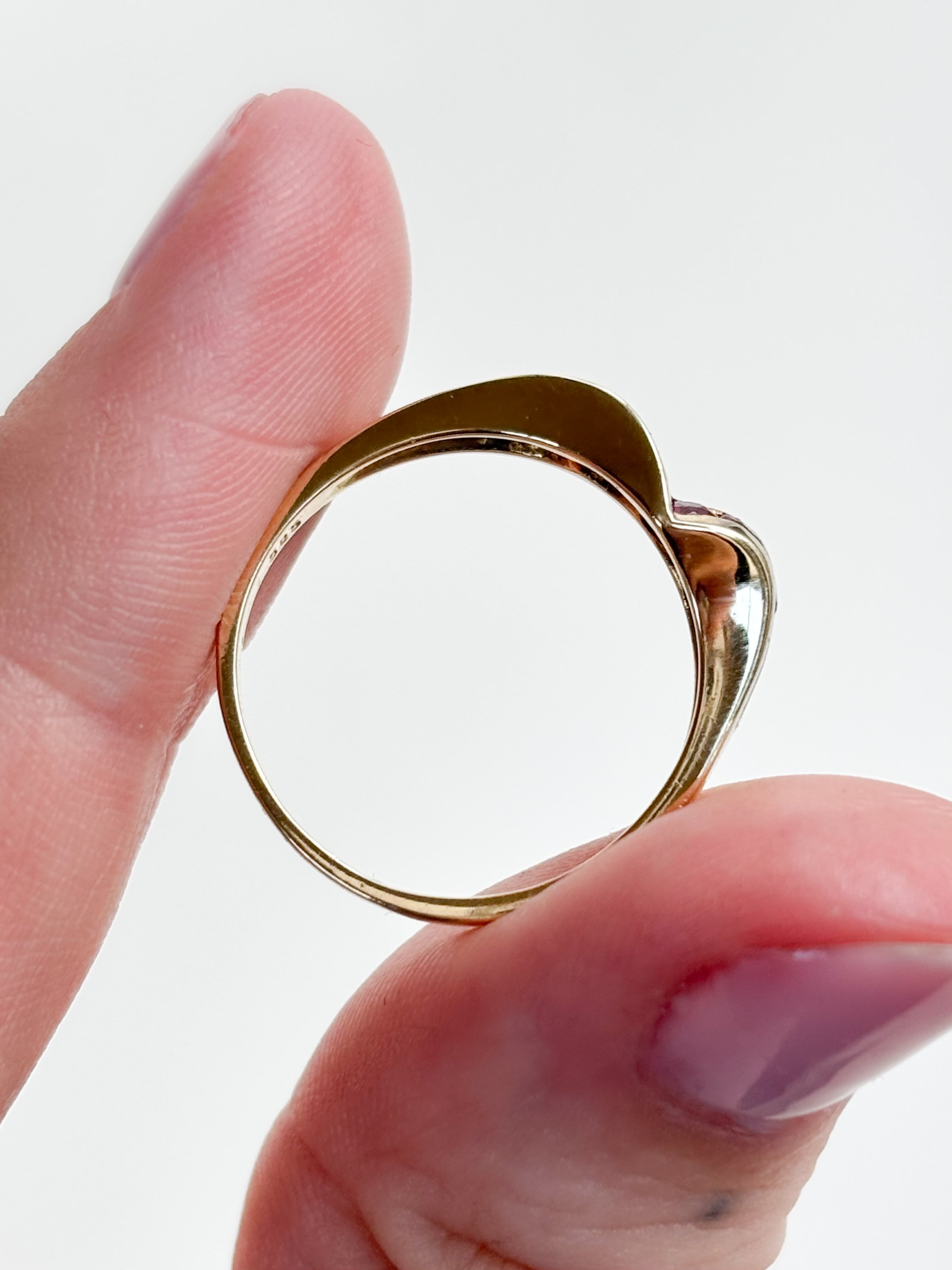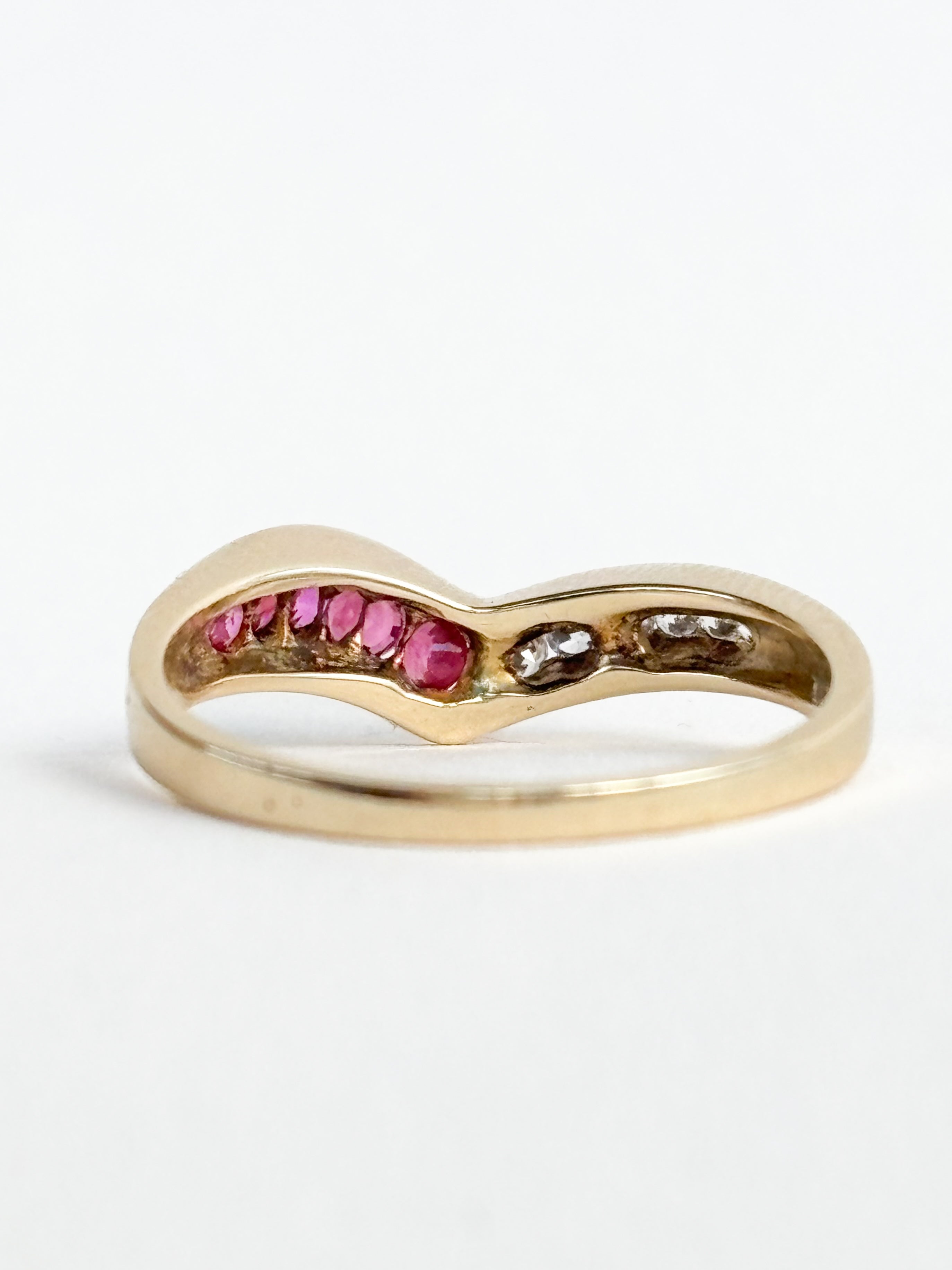 We are obsessed with the chevron, "v" shape of the band. It’s got such a cool, modern edge to it, and the way the two different stones meet at the peak is just visually satisfying. At 2.63g and a size N, it’s got a lovely, solid feel on the finger that feels secure and well-made.