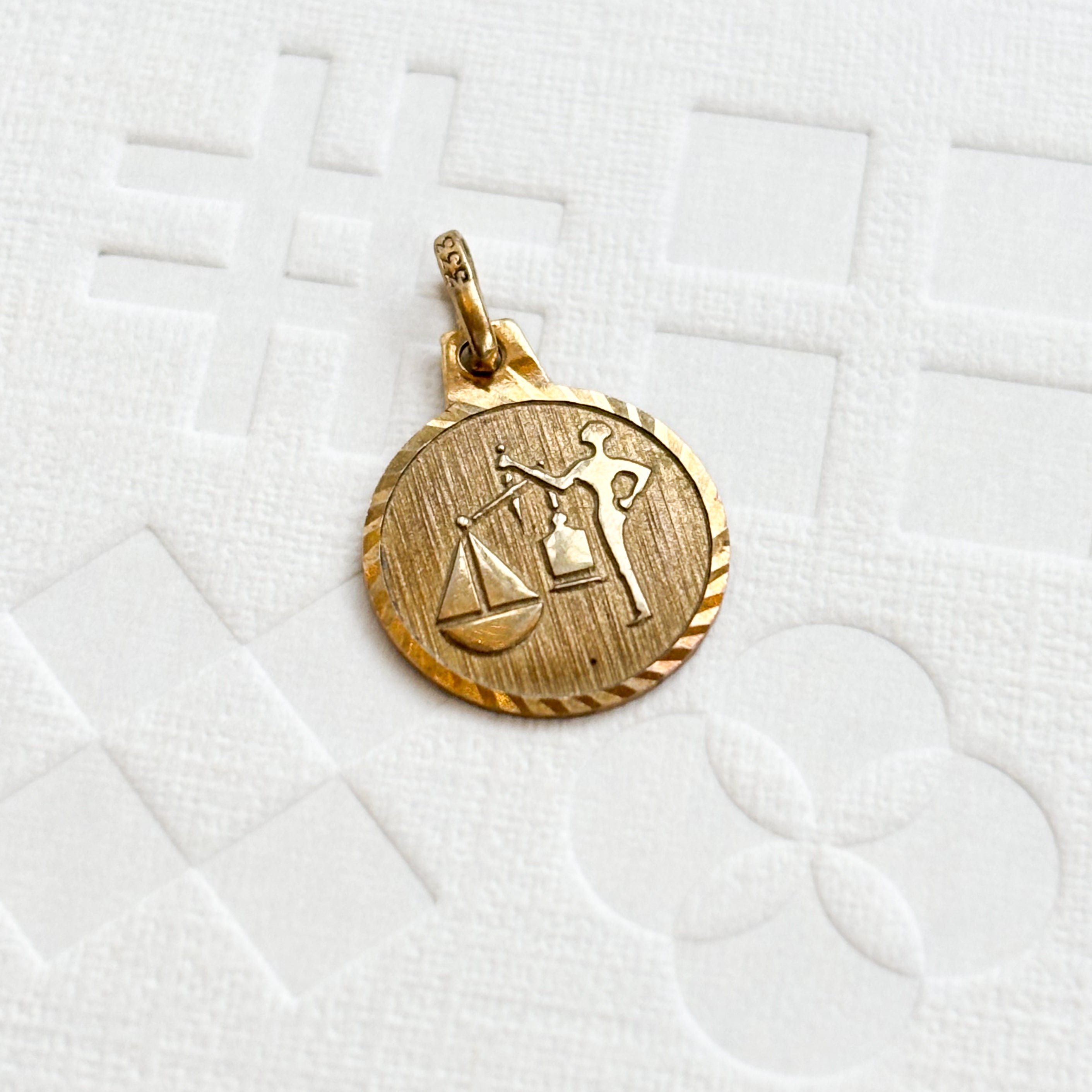 This small Libra medal is full of thoughtful detail — featuring a finely worked figure holding a set of scales, captured in warm 8ct gold. The design leans antique in the best way, with that hand-done feel that gives it real character. At just 12mm wide and 1.8 grams, it’s subtle but carries meaning.