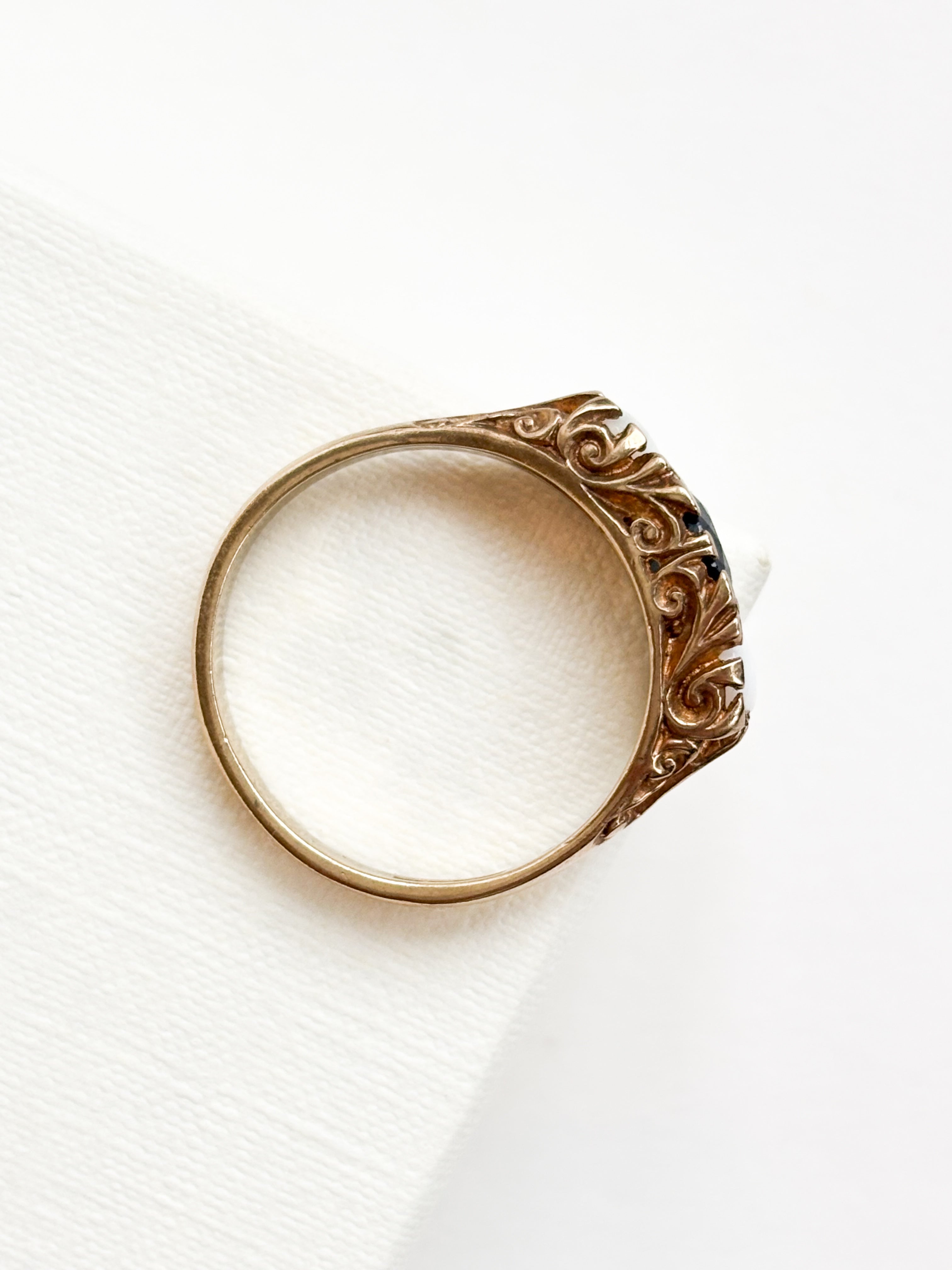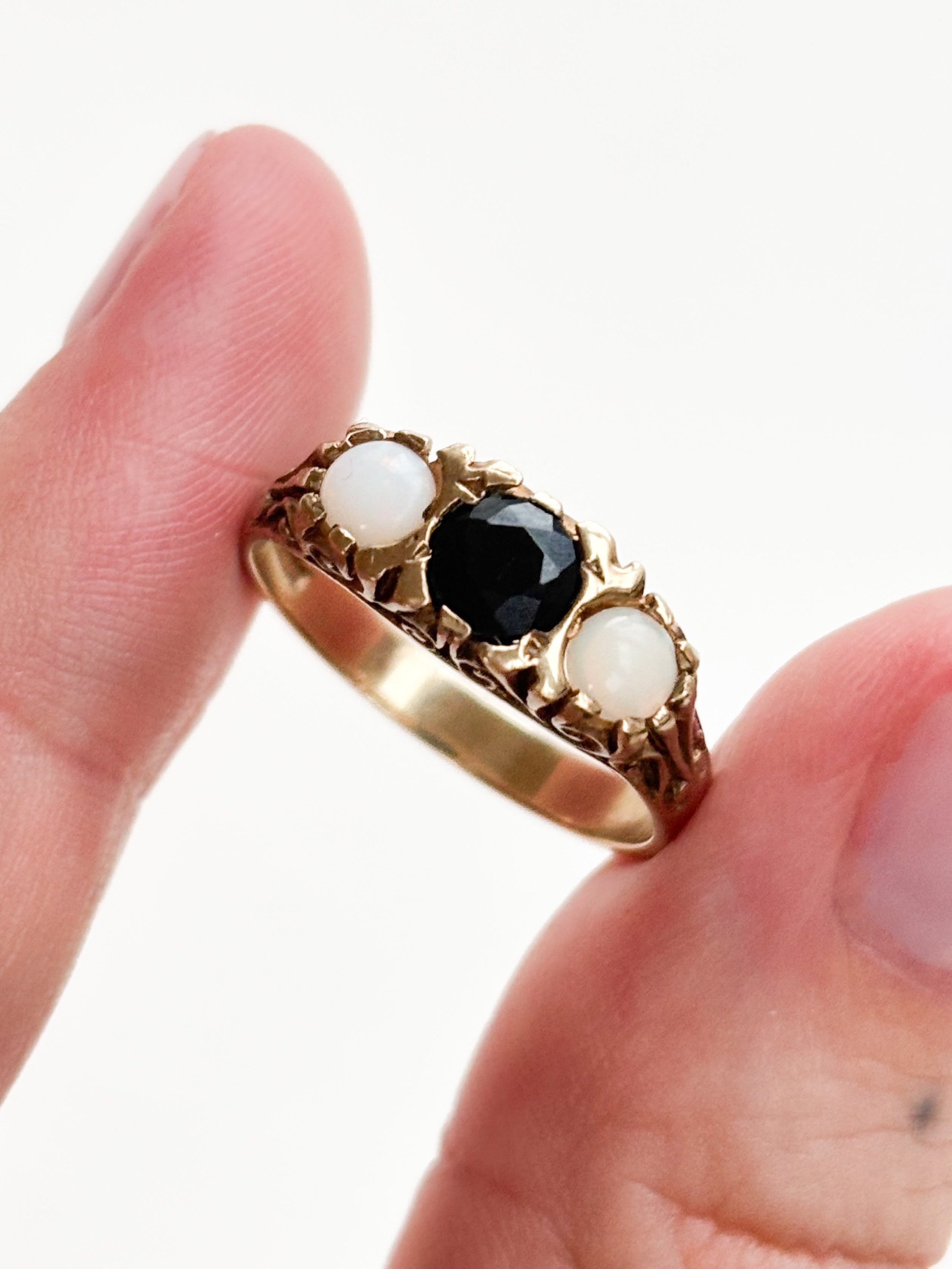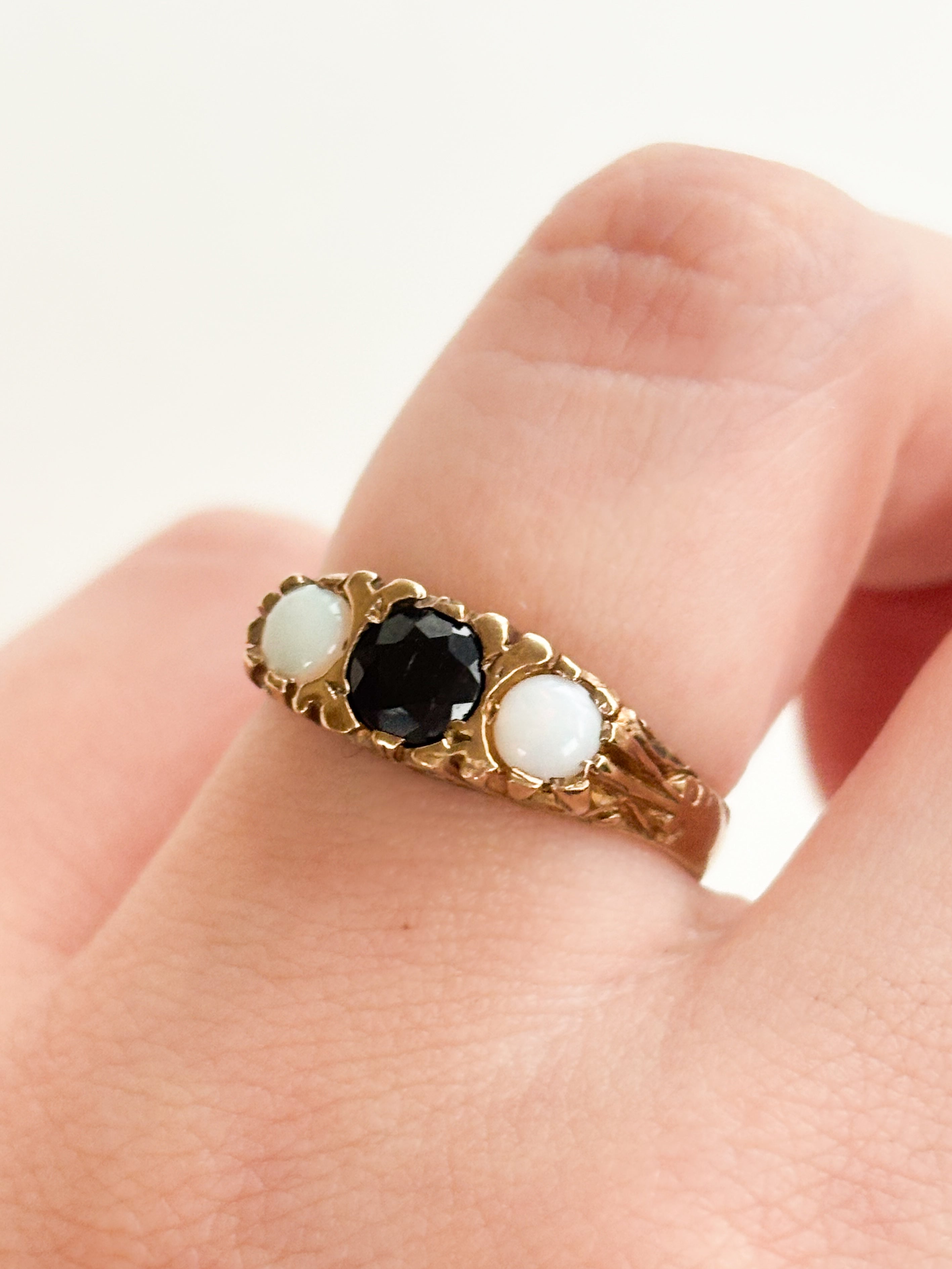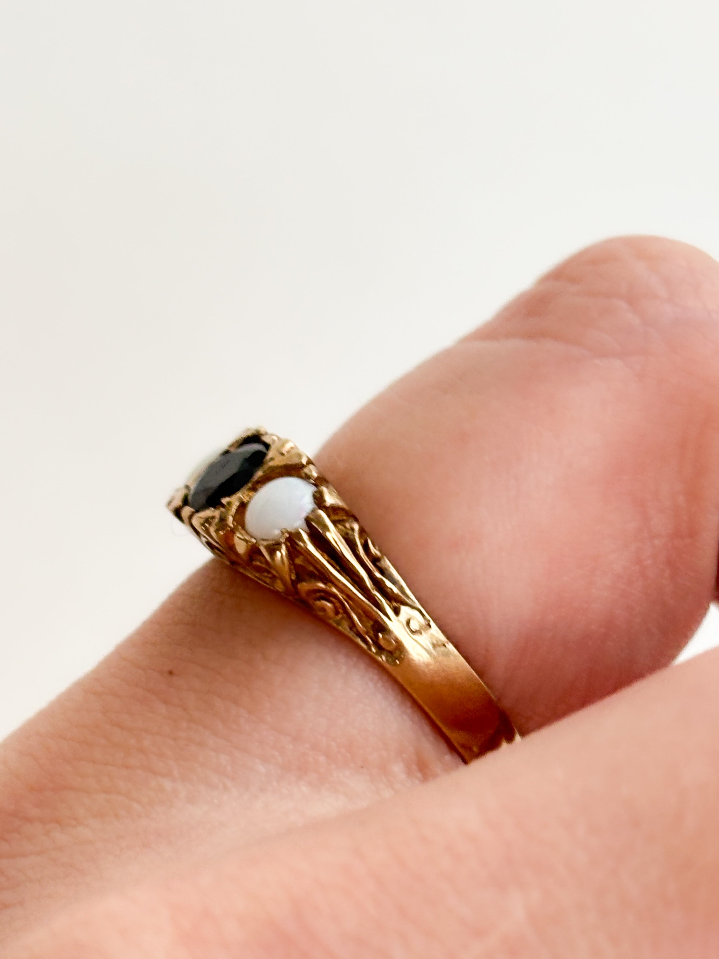 This Opal and Sapphire Trilogy Ring is a total Victorian-style dream, and honestly, the scrollwork detail on the gallery is enough to make any jewellery lover weak at the knees. It features a striking contrast between two glowing, iridescent opals and a deep blue sapphire center—a classic trilogy combination.