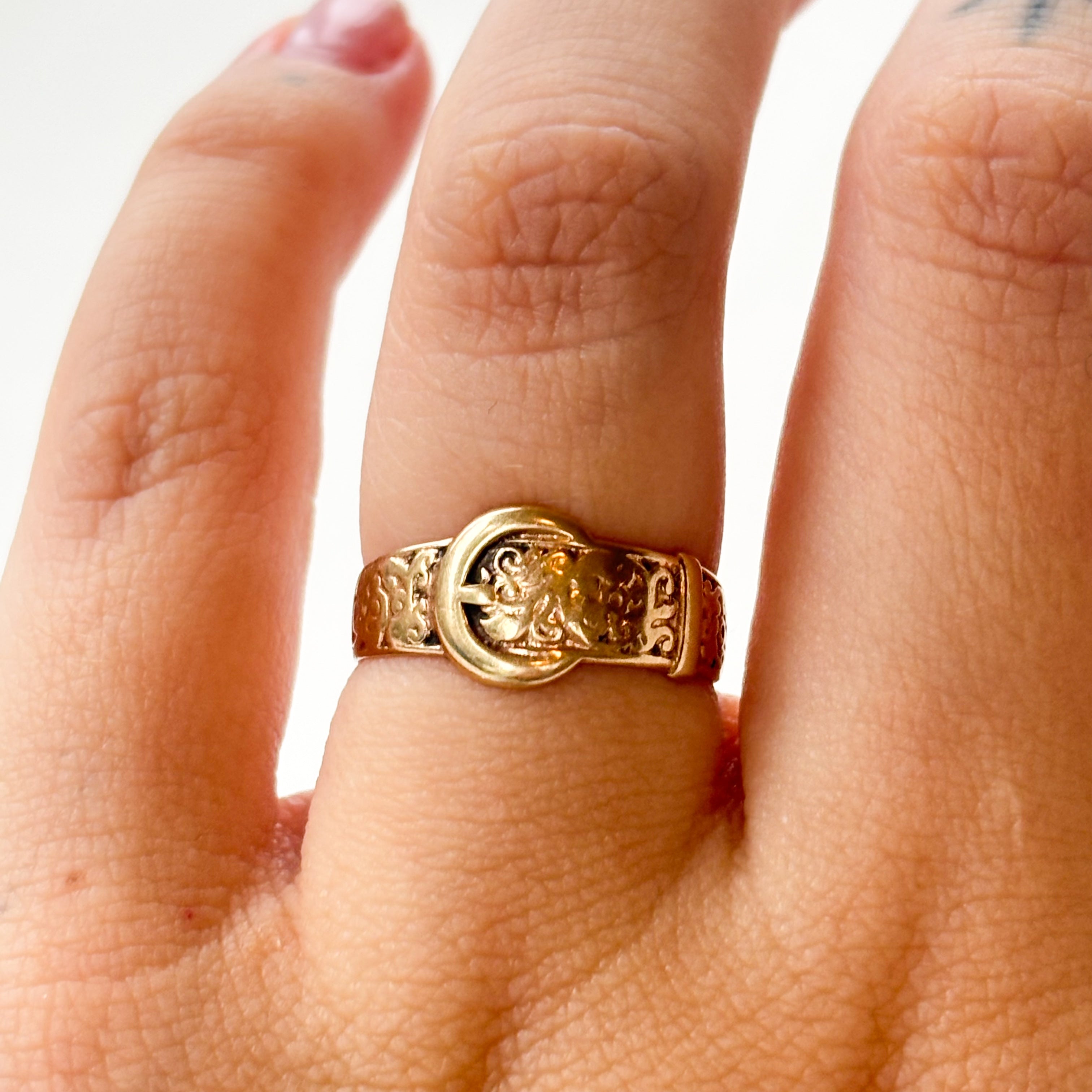 A 9ct gold belt-style ring with a subtle engraved repeat motif around the band. Weighing 1.9 grams, it has great coverage and presence on the finger, making it feel bigger than the price suggests.