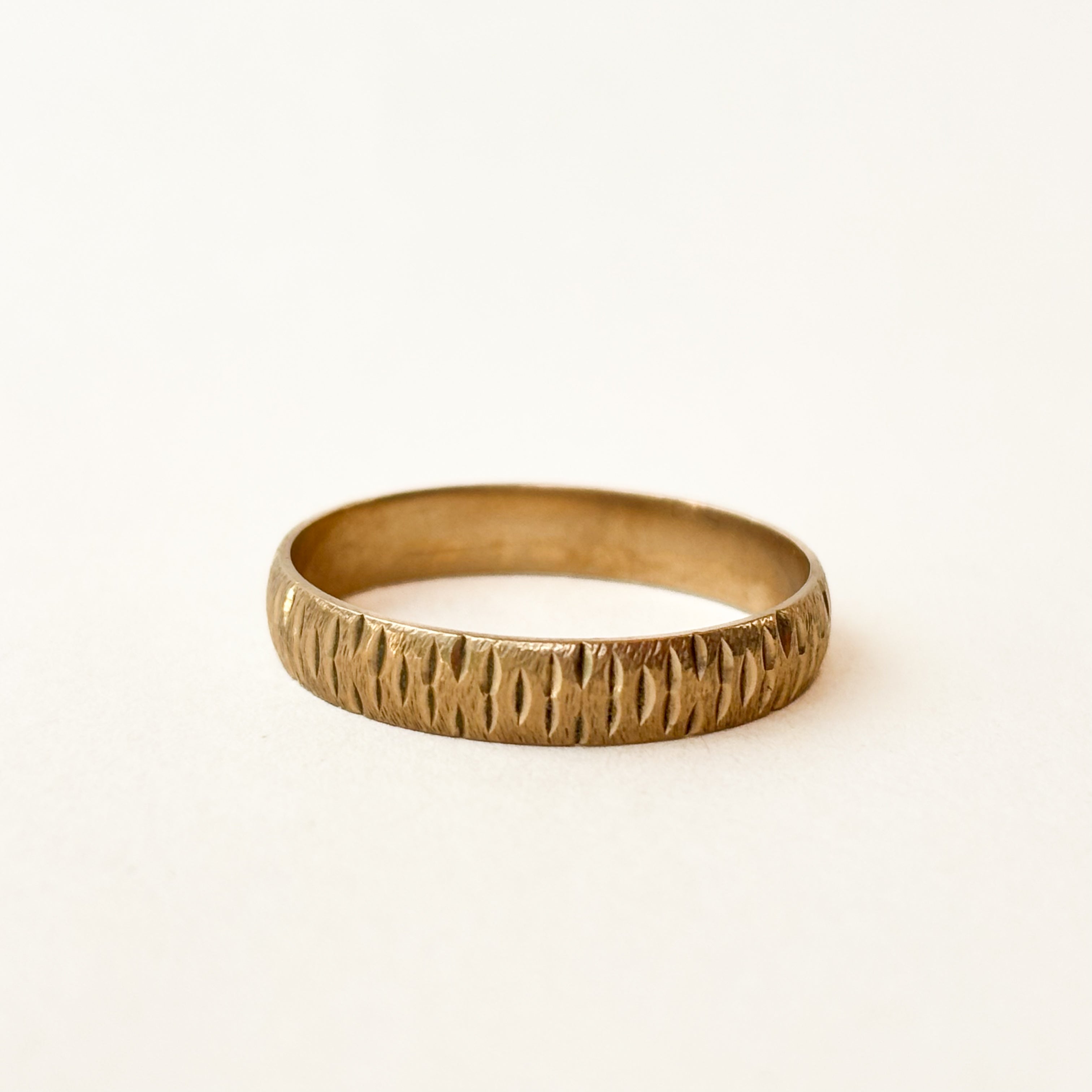A simple band with a bit of personality — this 9ct gold textured ring weighs 2 grams and is size R½. The etched surface adds depth and character, making it more than just a plain gold band.